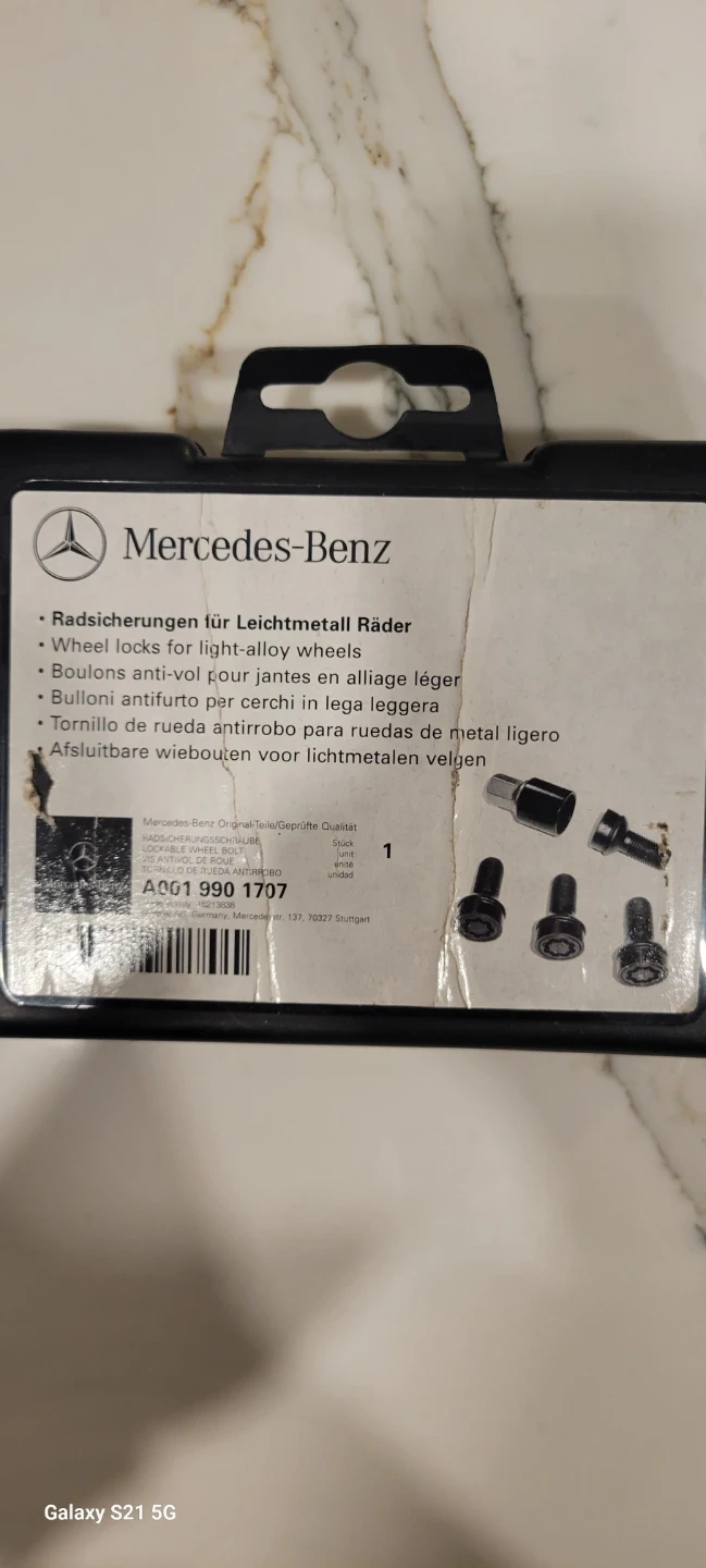 Selling a set of Mercedes-Benz wheel locks for light-alloy wheels. These are original Mercedes-Benz parts, designed as lockable wheel bolts to prevent theft. The part number is A001 990 1707.