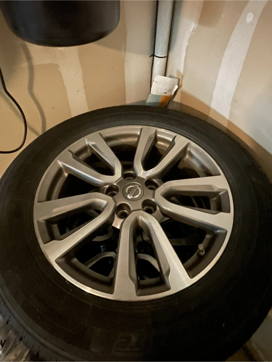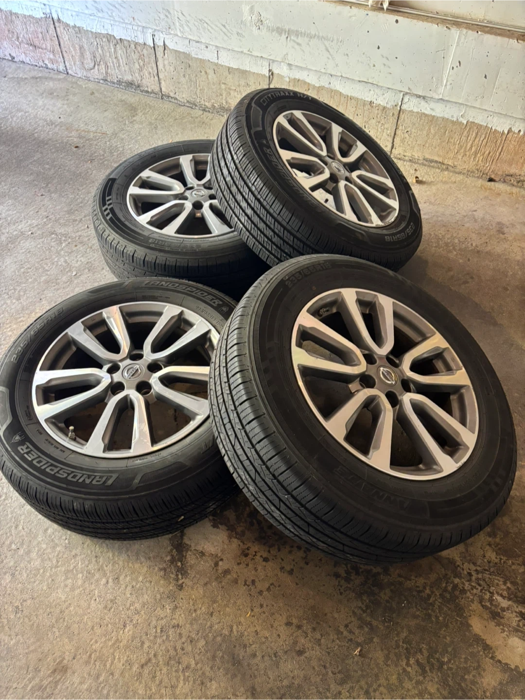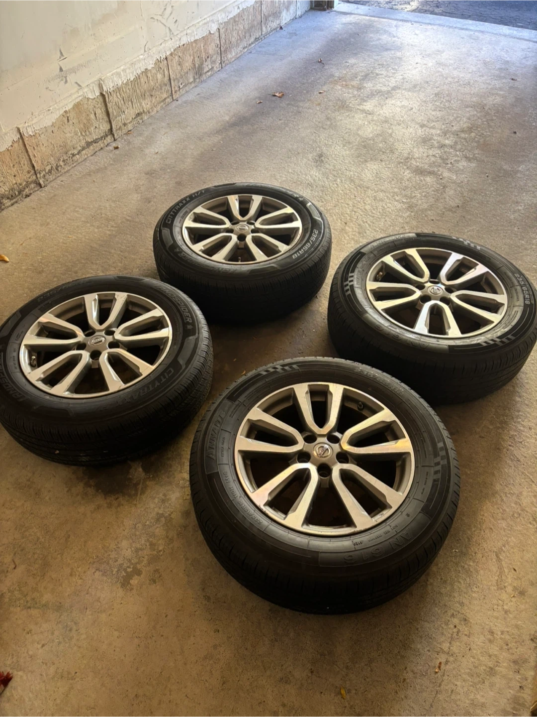 Selling a set of four Nissan tires mounted on rims. The tire size is 235/65R18. They show some signs of wear and tear, but are still in usable condition.