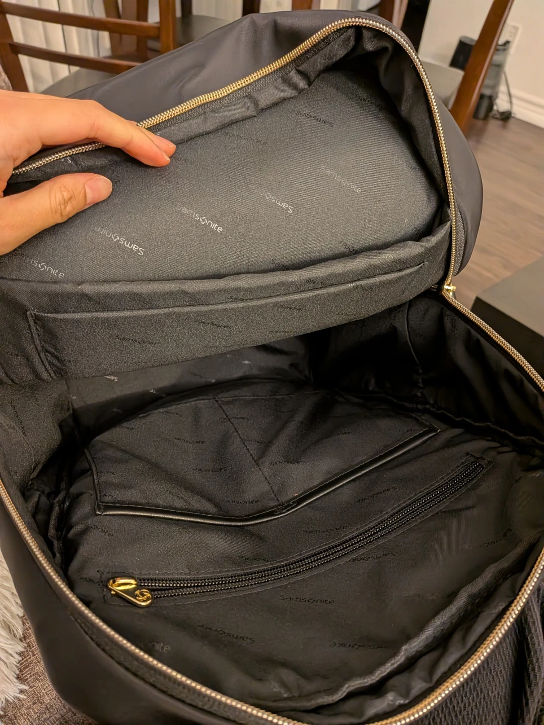 Elegant functional design. Has laptop and tablet sleeve. Water bottle and umbrella outside pockets. Suitcase strap at the back.