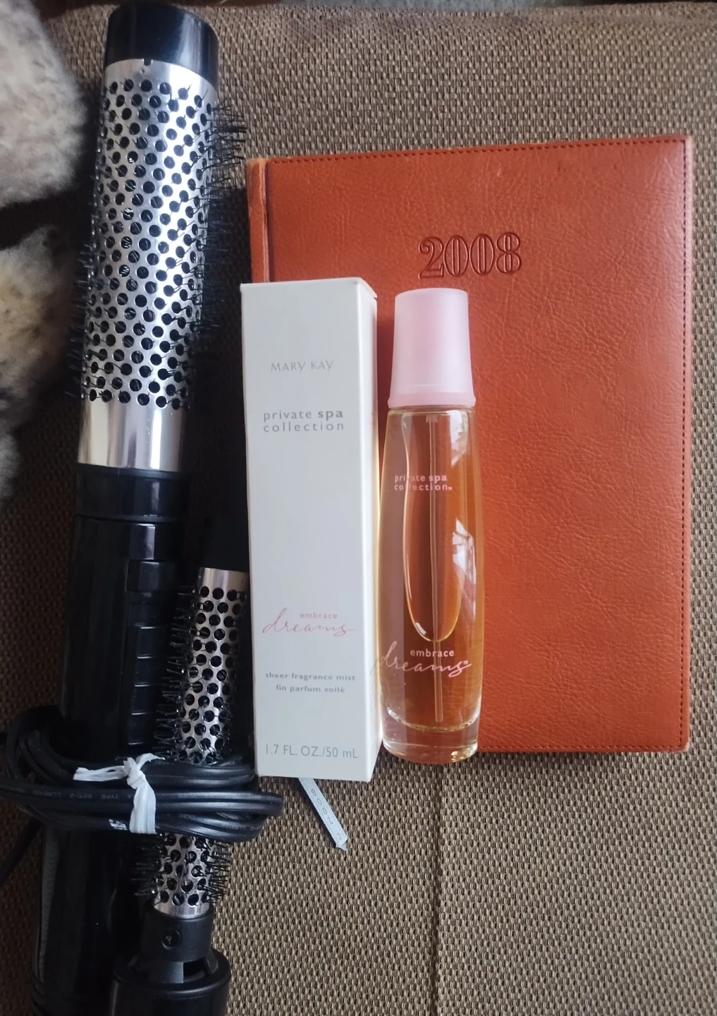 Selling a new 50ml Mary Kay Embrace Dreams sheer fragrance mist from the Private Spa Collection, plus a hair dryer with 2 barrels and a 2008 day journal with maps. $10 for all.