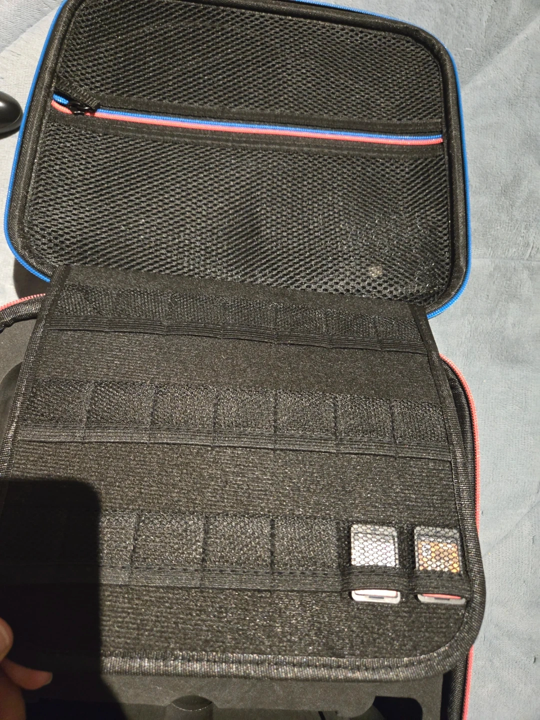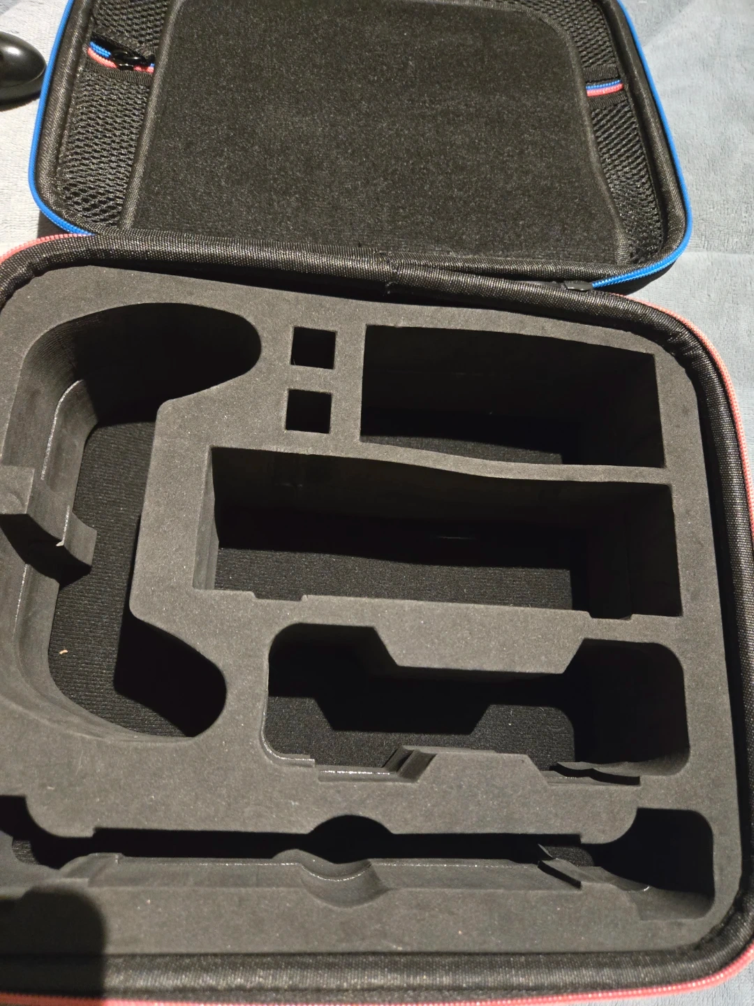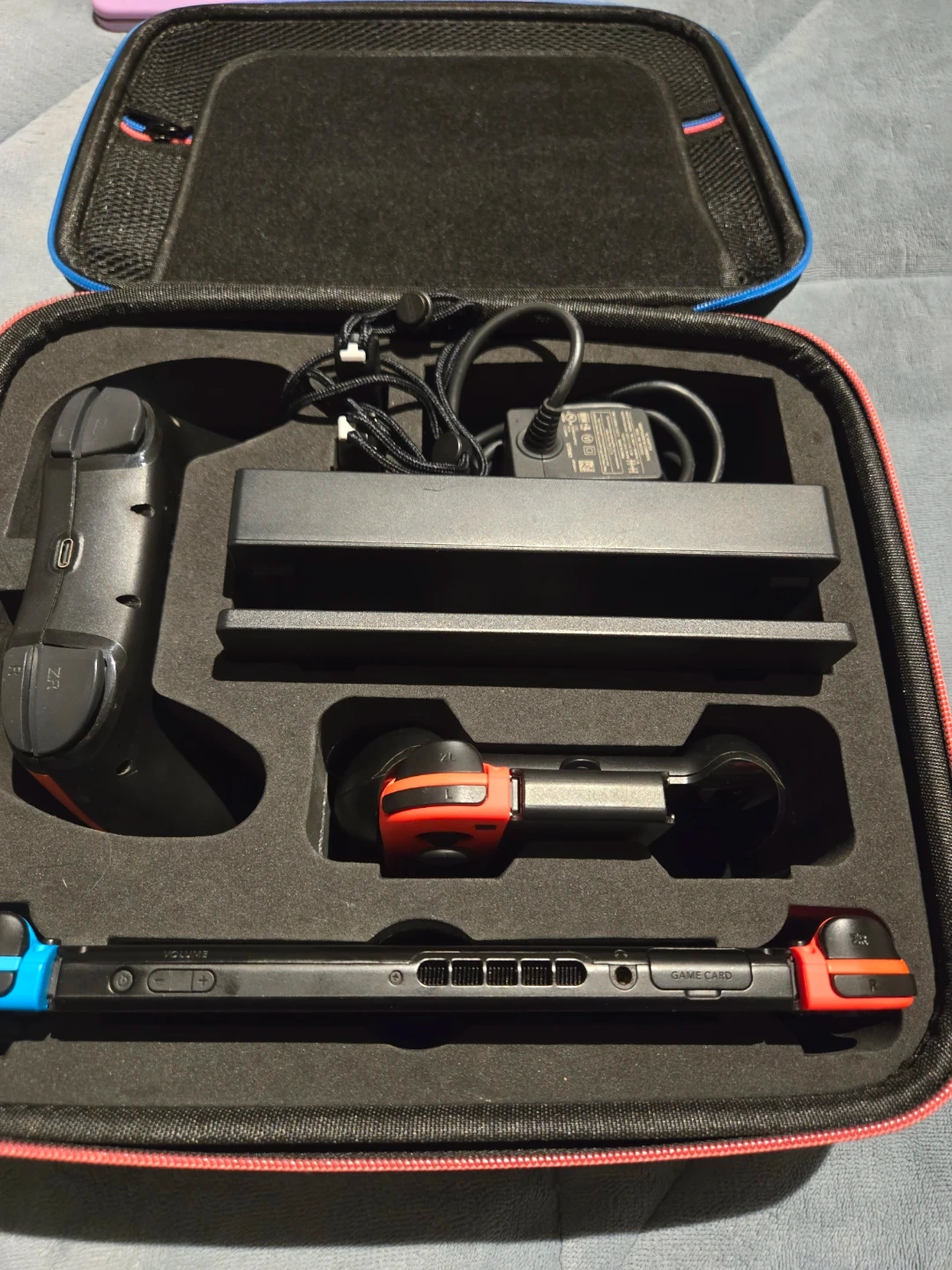 Includes console, Joy-Cons, controller grip, charger, dock, and heavy-duty travel case with custom foam cutouts.