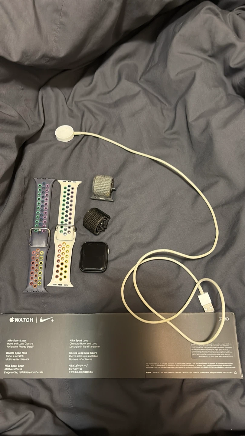 Selling my Apple Watch, which comes with a variety of Nike Sport Loops! Also included is the original box and charger. The bands feature a hook and loop closure, with reflective thread detailing. Great for workouts or everyday wear! Trades accepted