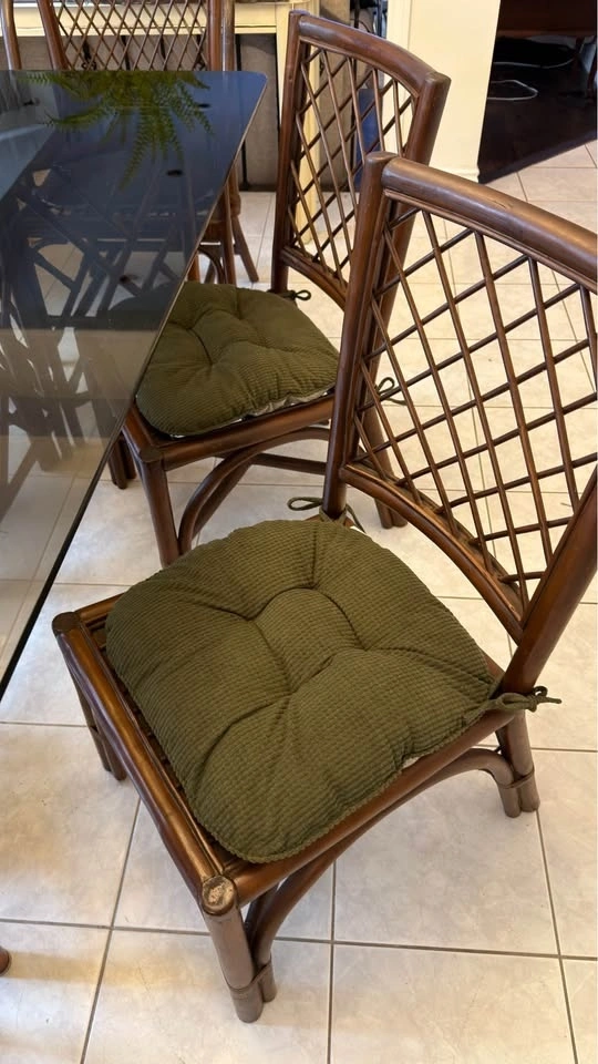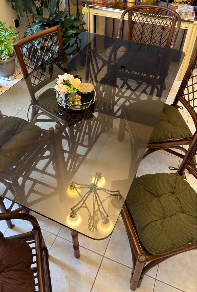 Rattan and bamboo vintage dining table (6 chairs) retail $2500 thick glass