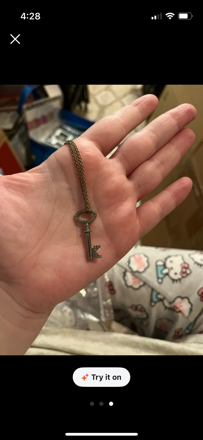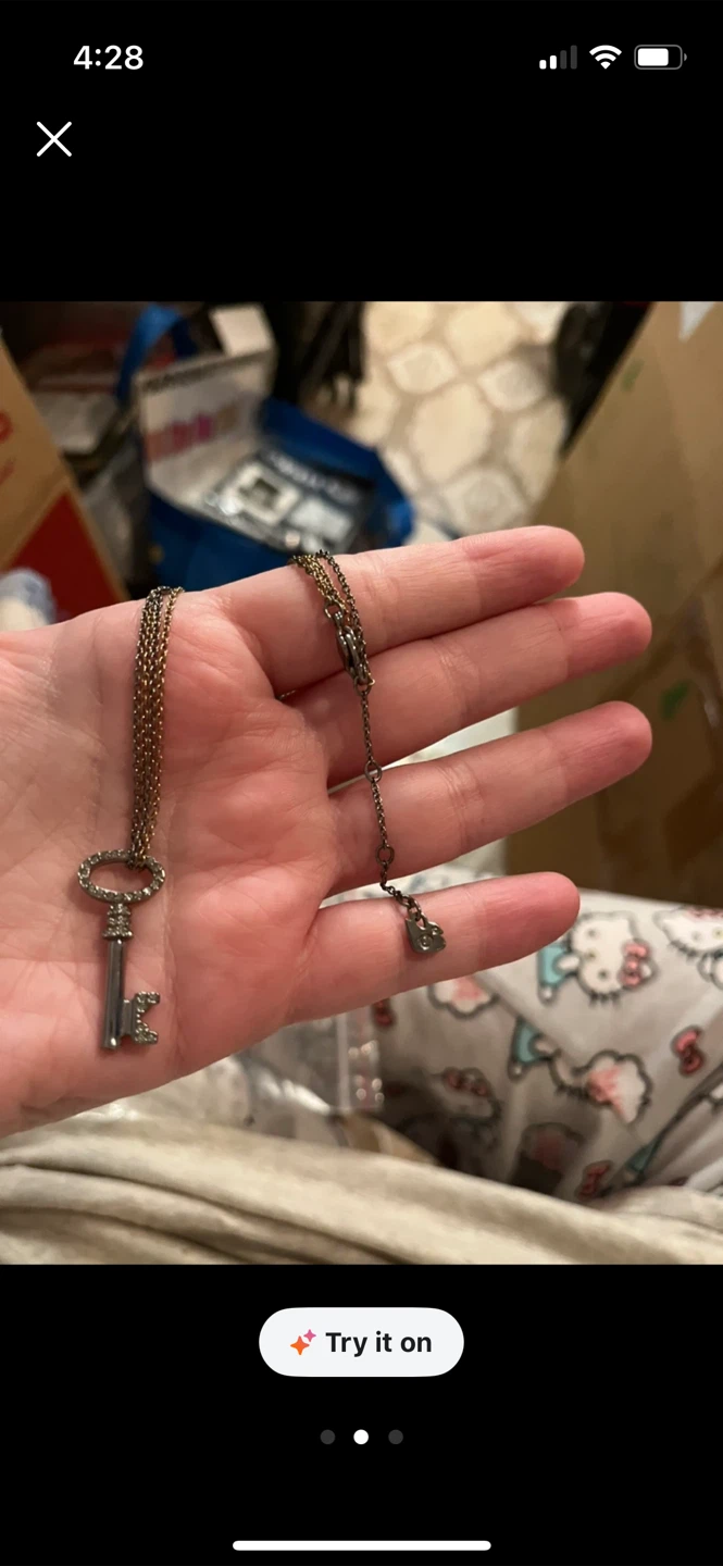 Selling a key pendant necklace. It has a vintage look with a long chain. Perfect for adding a unique touch to any outfit!