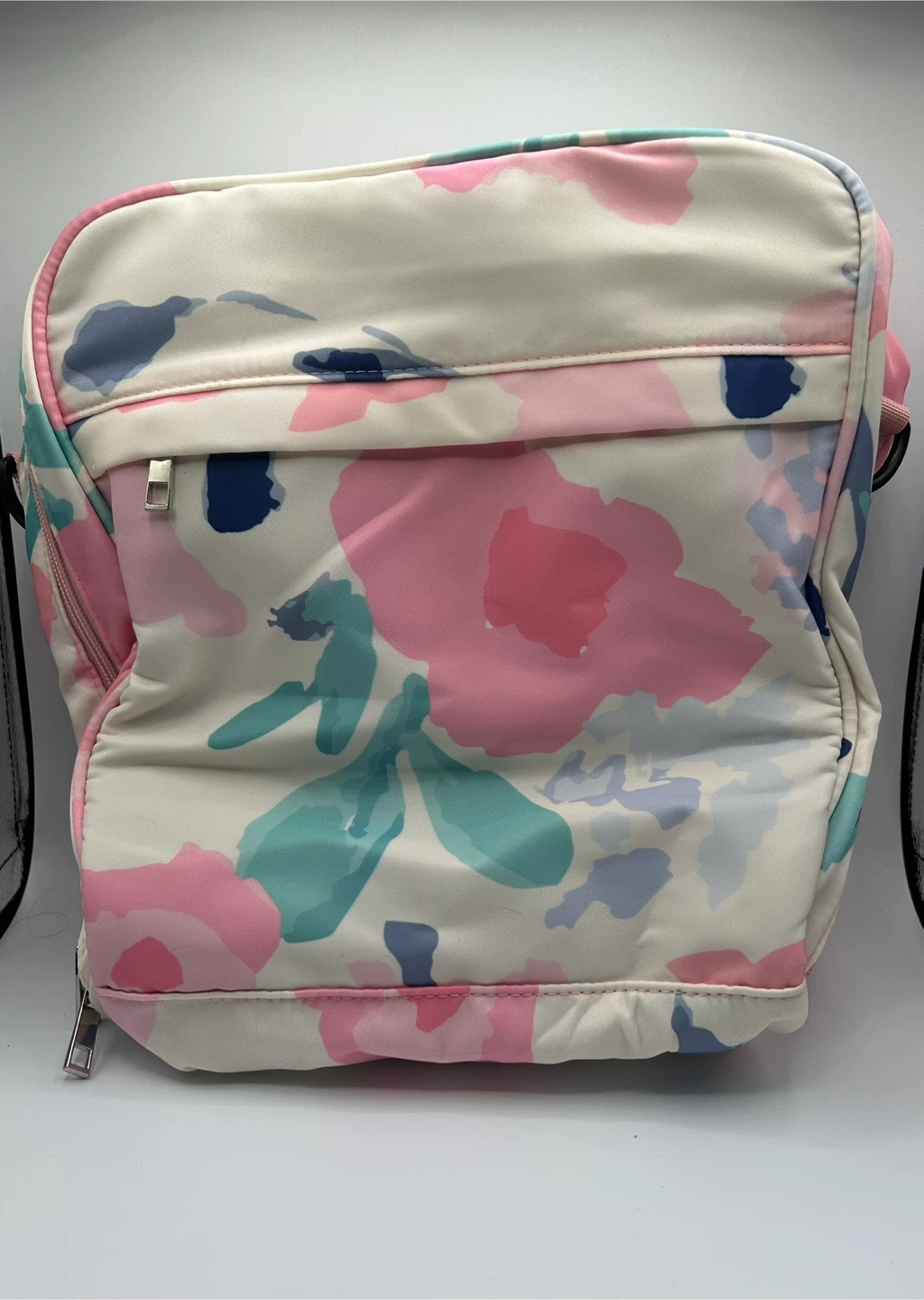 Description: Brighten up your lunch routine with this beautiful, multi-colored floral insulated lunch bag! Perfect for work, school, picnics, or travel. The eye-catching watercolor-style floral print features lovely shades of pink, teal, and navy blue.
