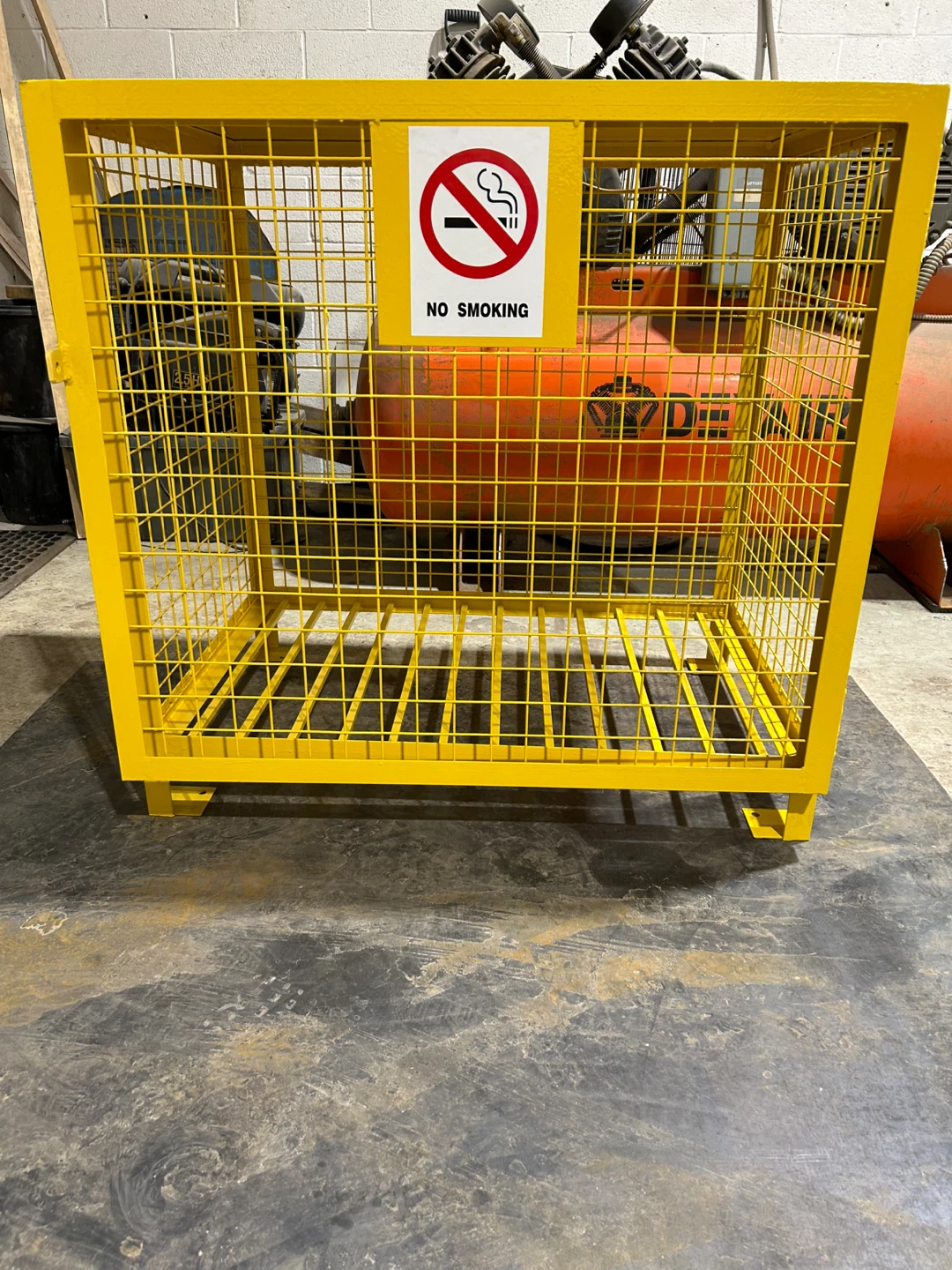 Here's a metal storage propane cage, perfect for organizing your space! It's in good condition and comes in a bright yellow colour.