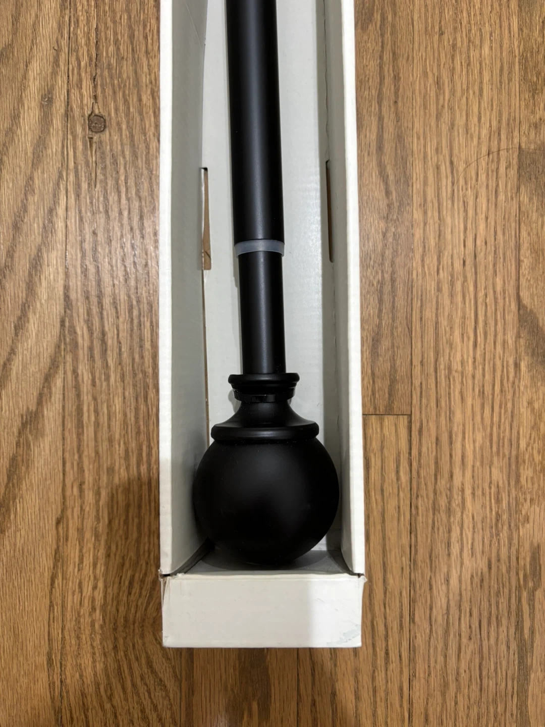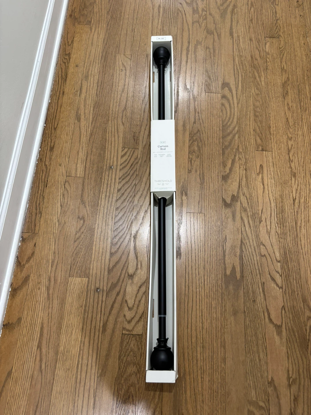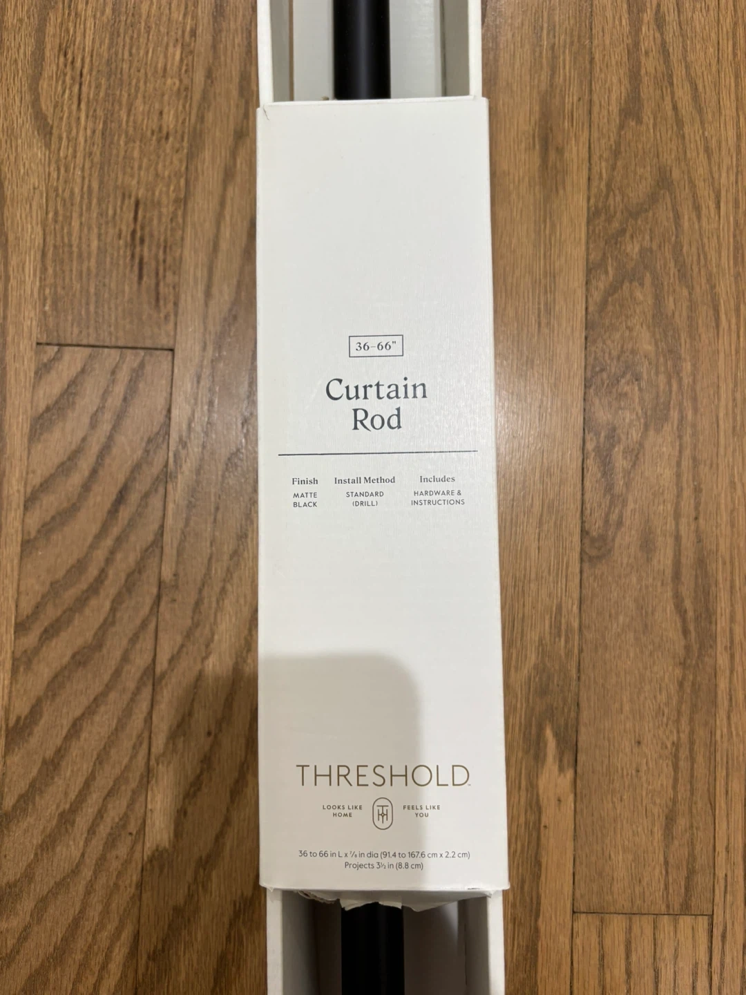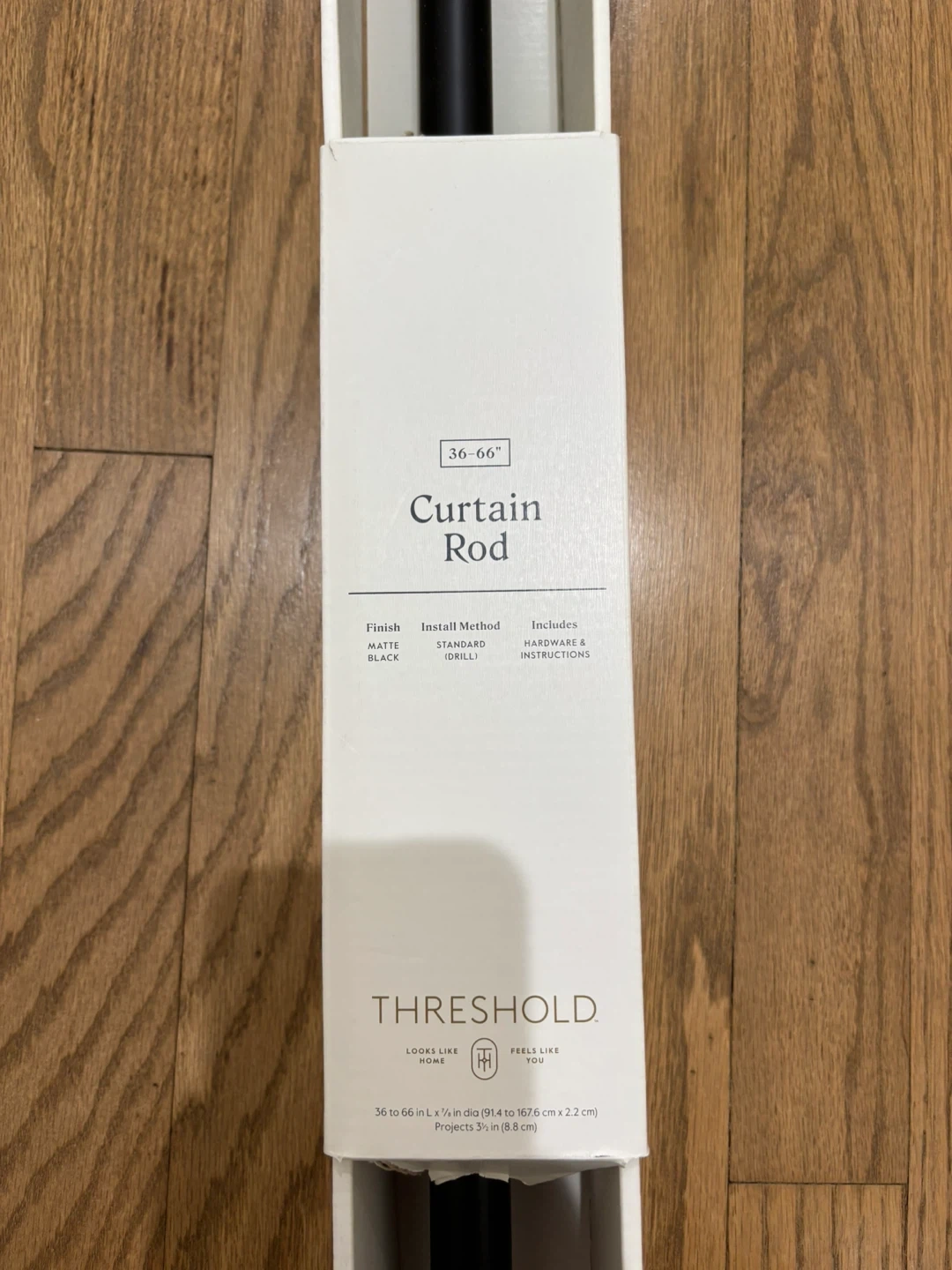 Selling a brand new Threshold curtain rod, still in its original packaging! It's a sleek matte black finish and extends from 36 to 66 inches. Includes all the necessary hardware and instructions for easy installation.