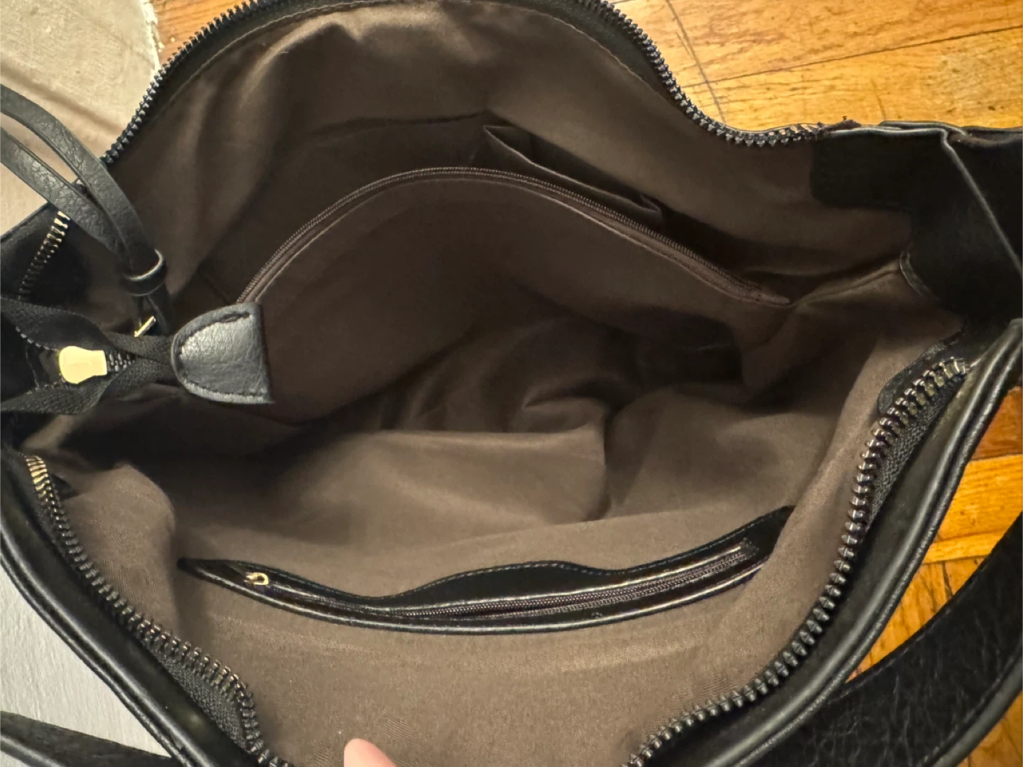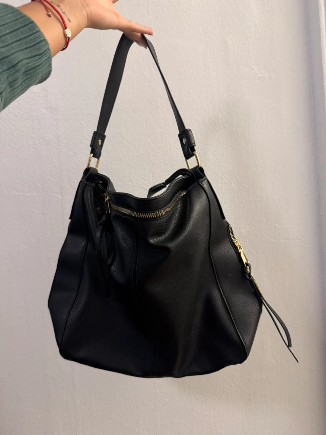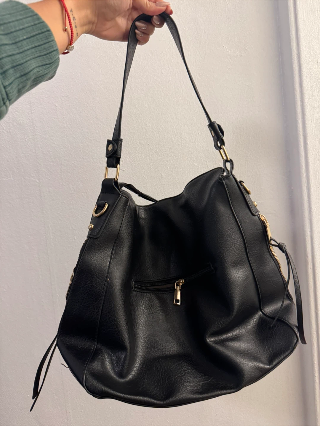 This is a stylish black hobo bag. It's made of faux leather and is perfect for everyday use. New and has plenty of room for all your essentials