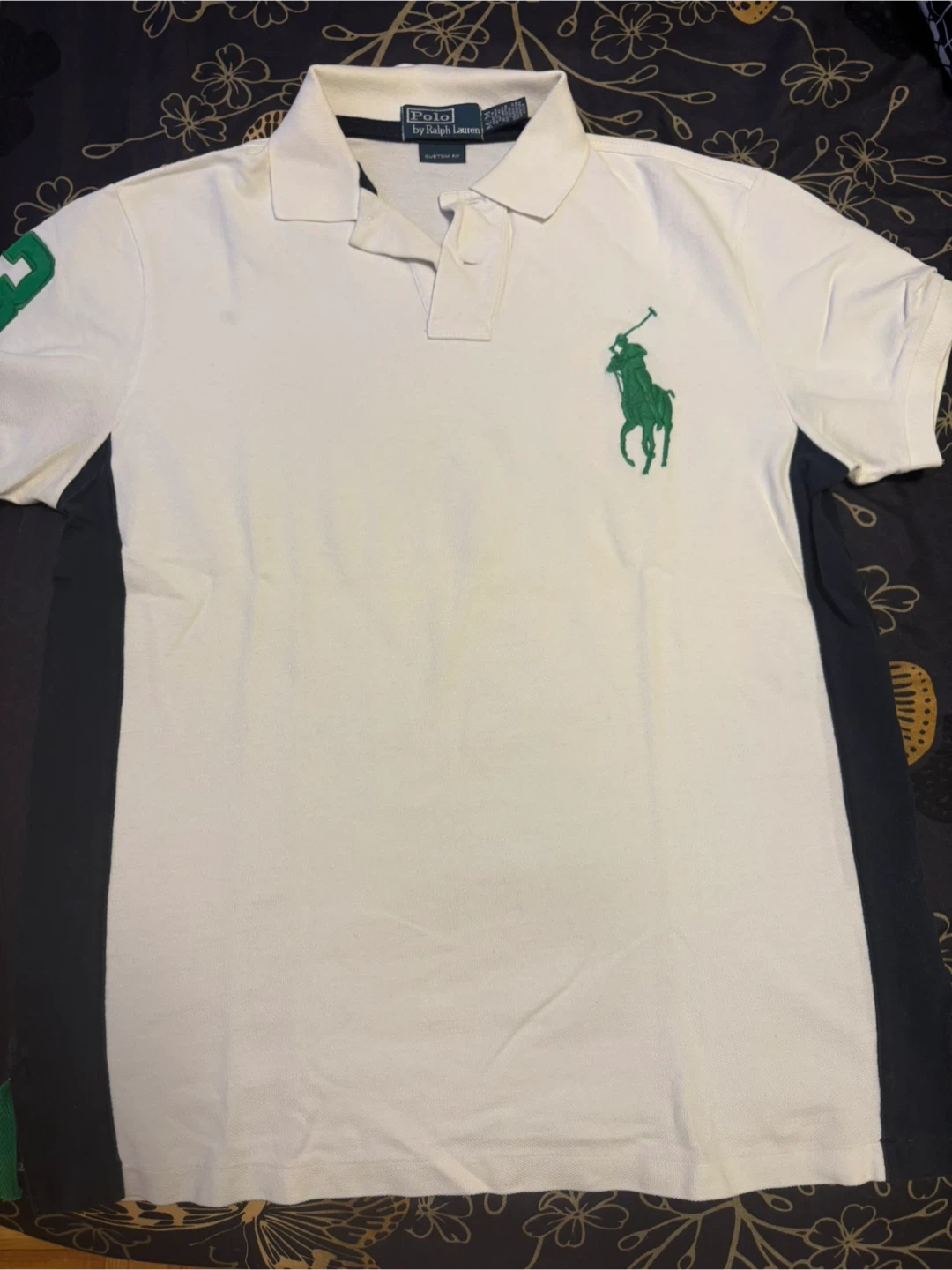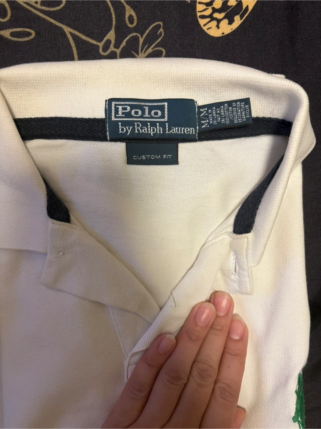 One is a Polo by Ralph Lauren Custom Fit in white with a green logo, size M.