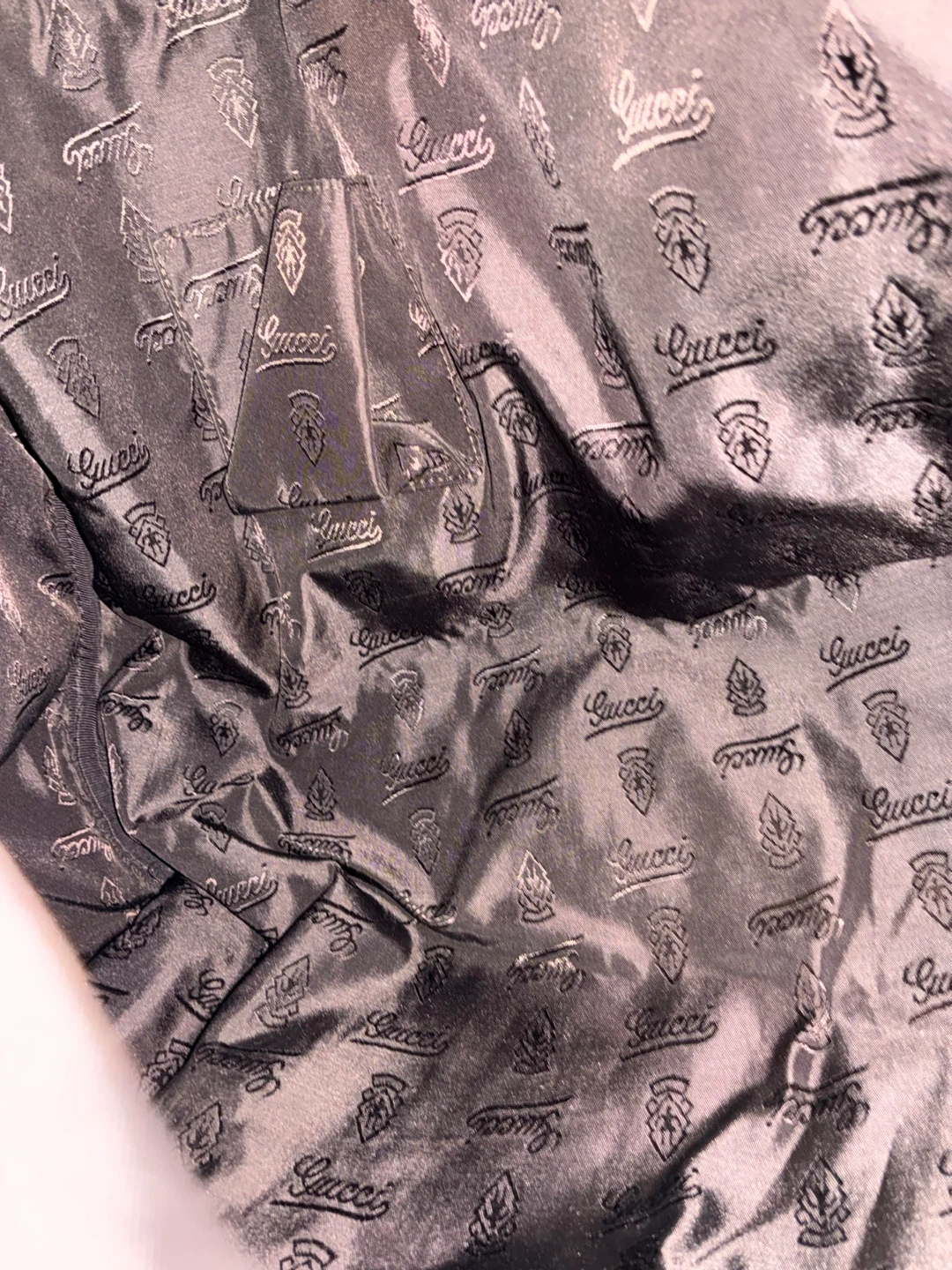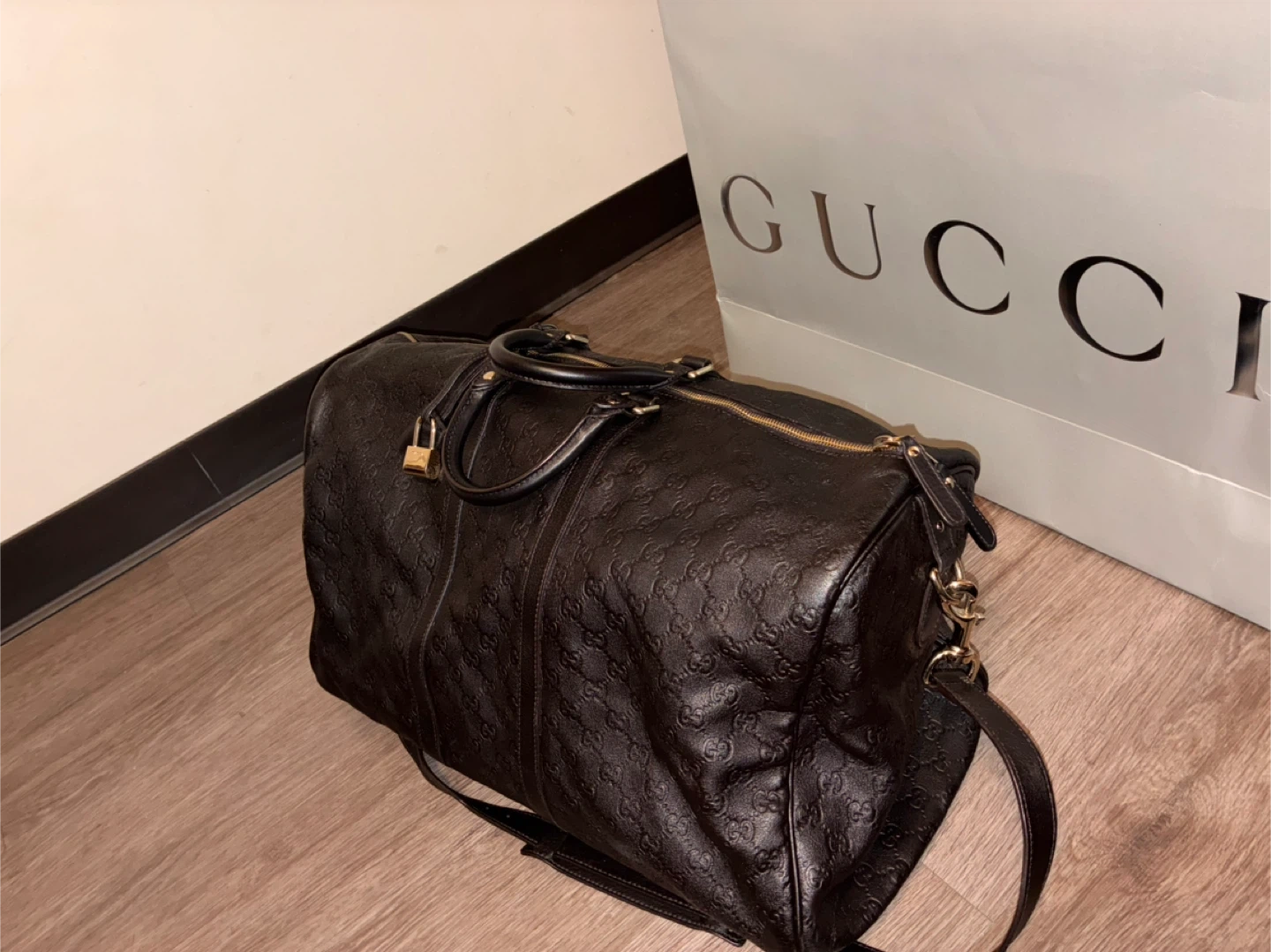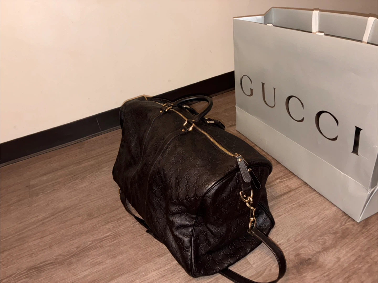 This is a black Gucci duffle bag! It has a zipper closure and a shoulder strap. The interior lining has the Gucci logo printed throughout. It comes with the original Gucci shopping bag! Safe location pickup available, text with questions……..