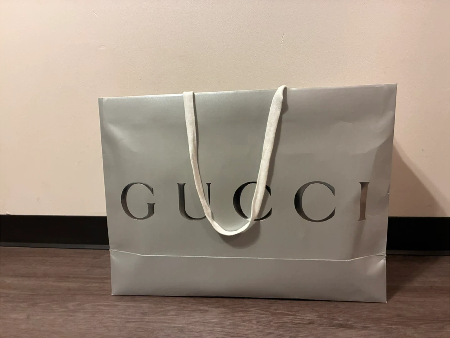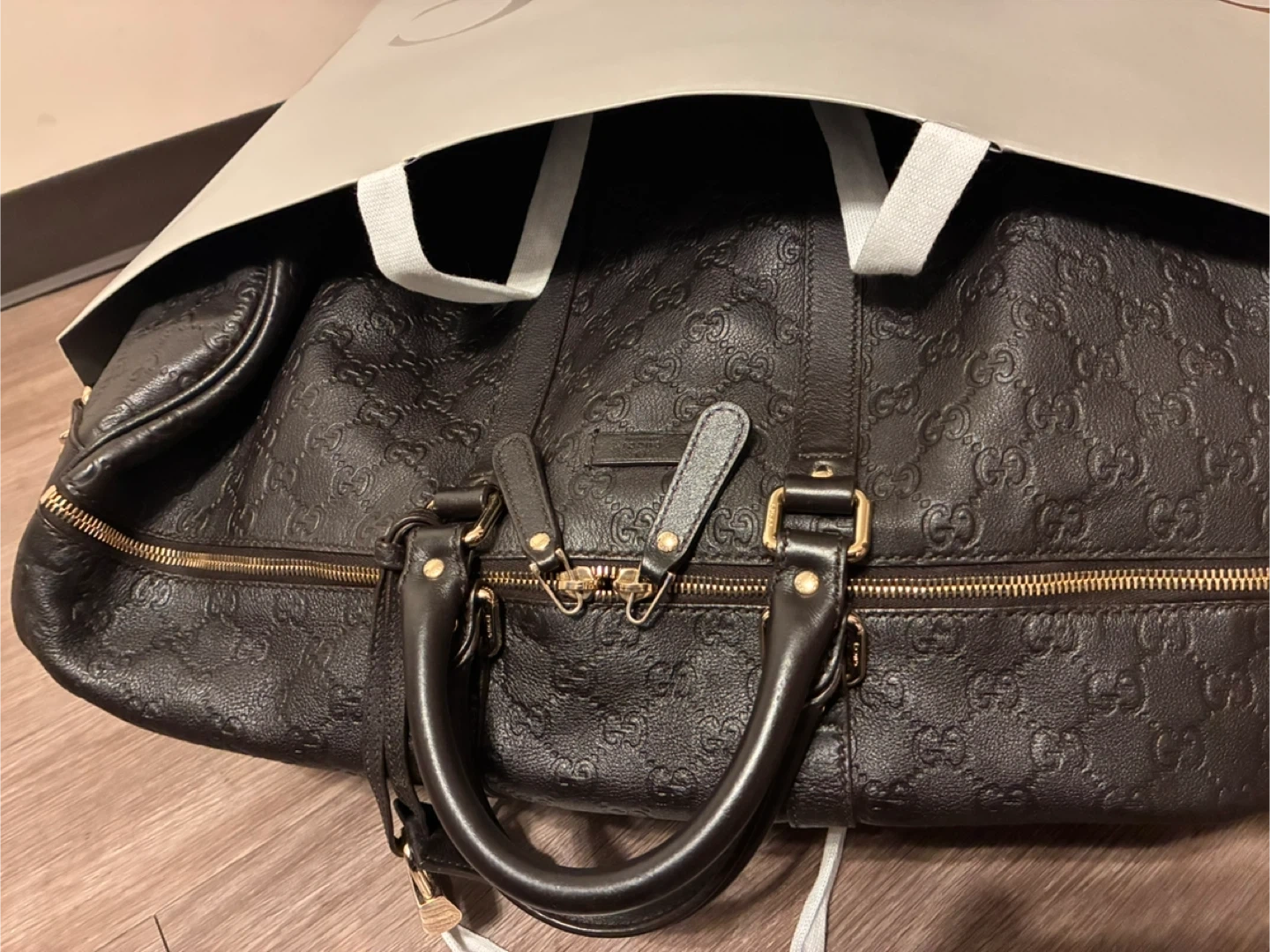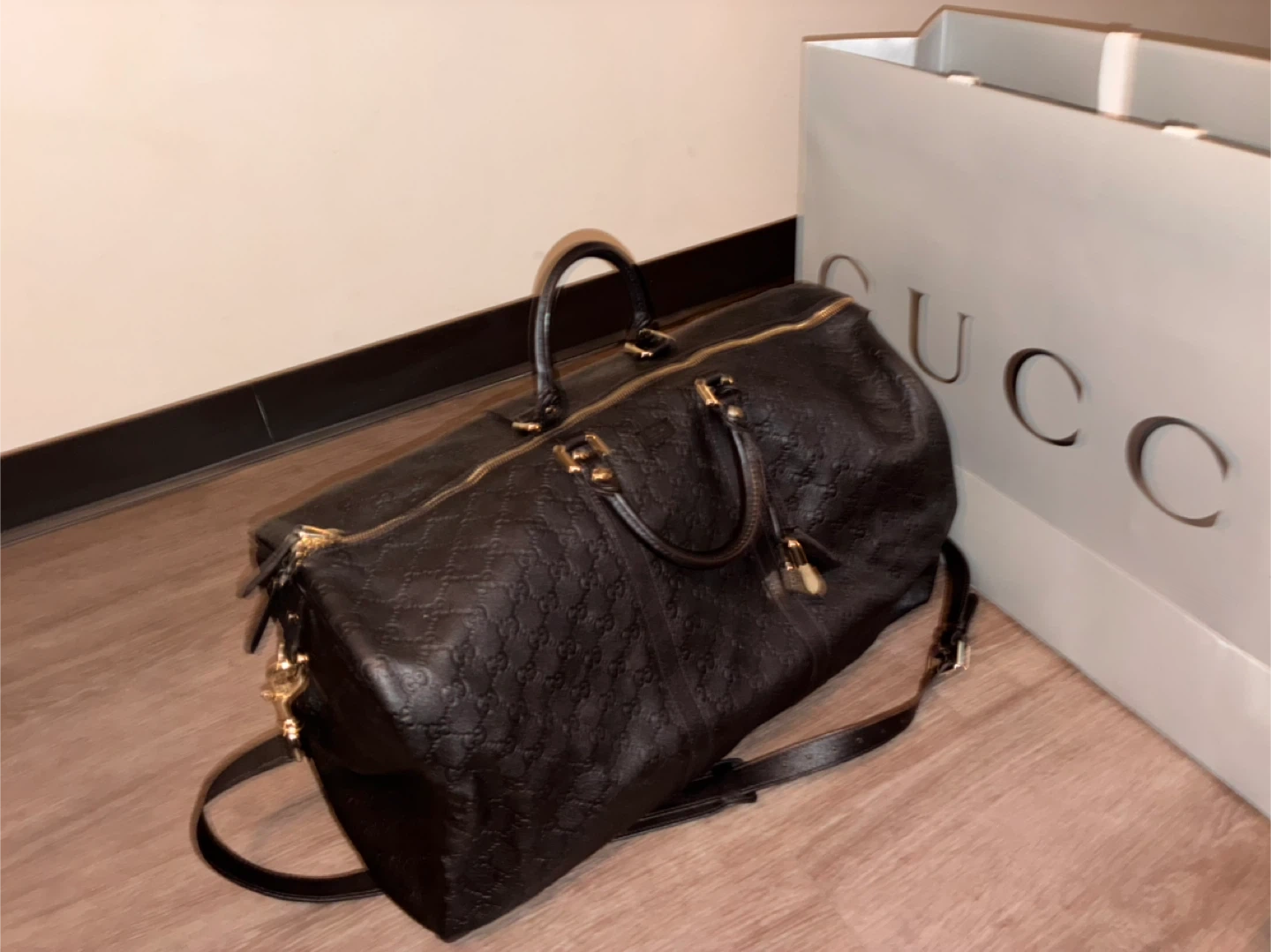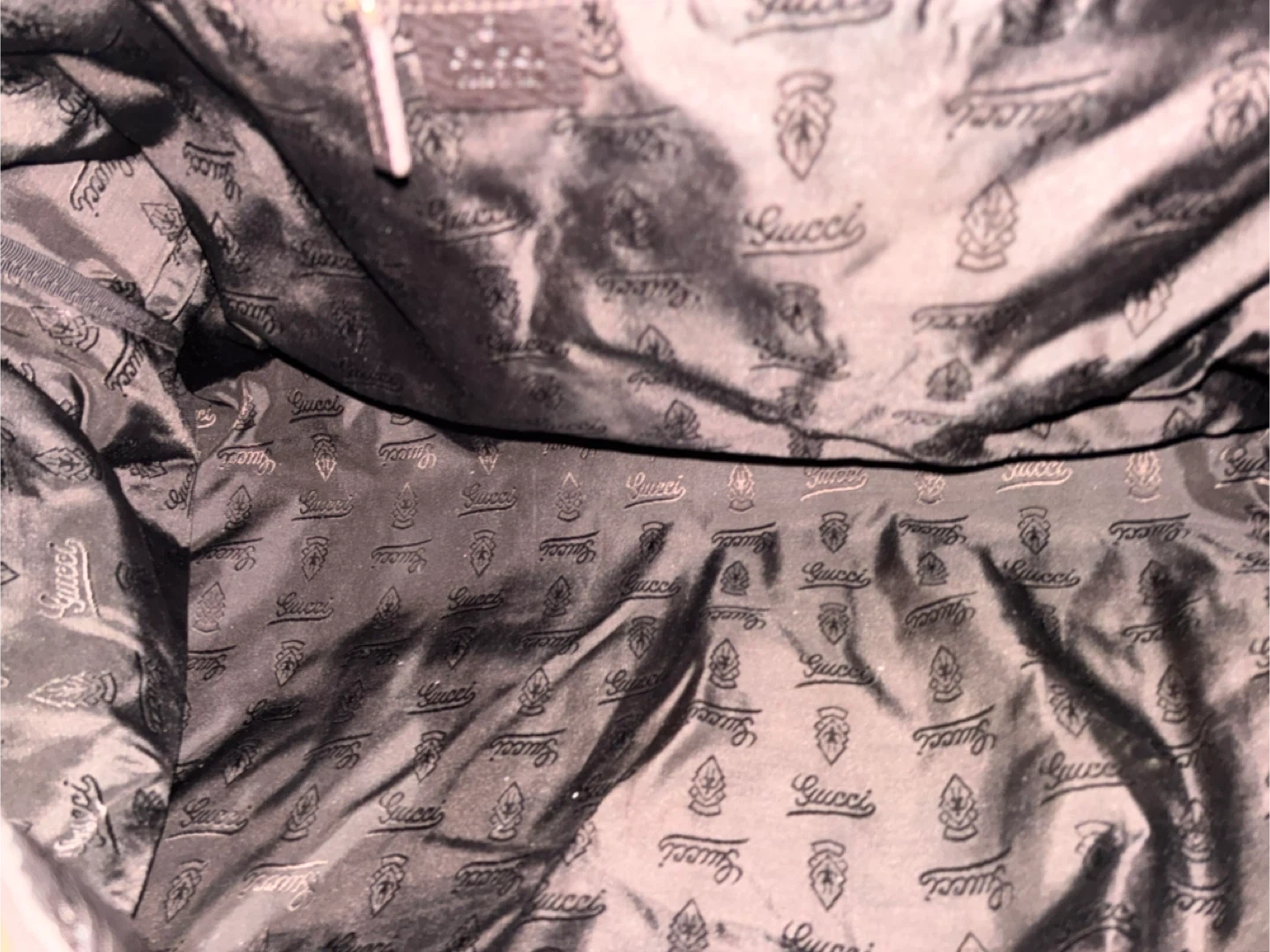 This is a black Gucci duffle bag! It has a zipper closure and a shoulder strap. The interior lining has the Gucci logo printed throughout. It comes with the original Gucci shopping bag! Safe location pickup available, text with questions……..
