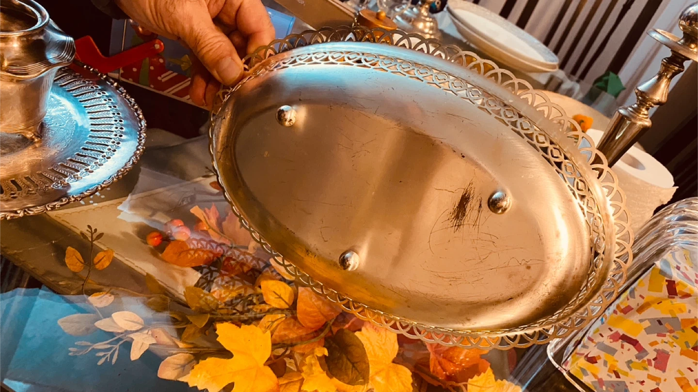 Selling a vintage silver-plated serving tray! It has a lovely, intricate design around the edge and would look great on any table. There are some signs of wear, as you can see in the photos, but it still has lots of charm