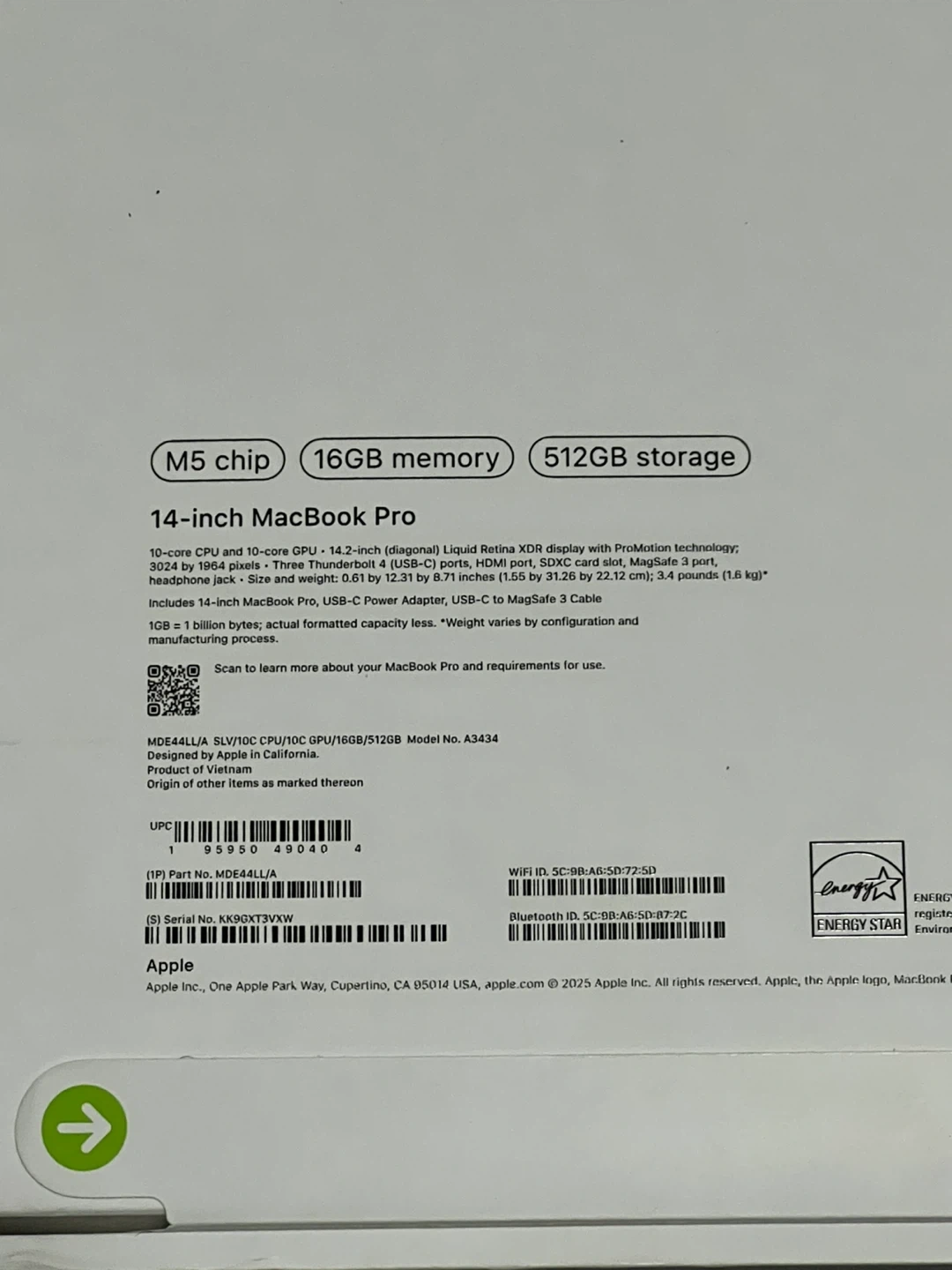 Selling a 14-inch MacBook Pro with the powerful M5 chip, 16GB memory, and 512GB storage. It features a Liquid Retina XDR display with ProMotion technology. The box includes the 14-inch MacBook Pro, a USB-C Power Adapter, and a USB-C to MagSafe 3 Cable. Model number is MDE44LL/A. Get yours today!