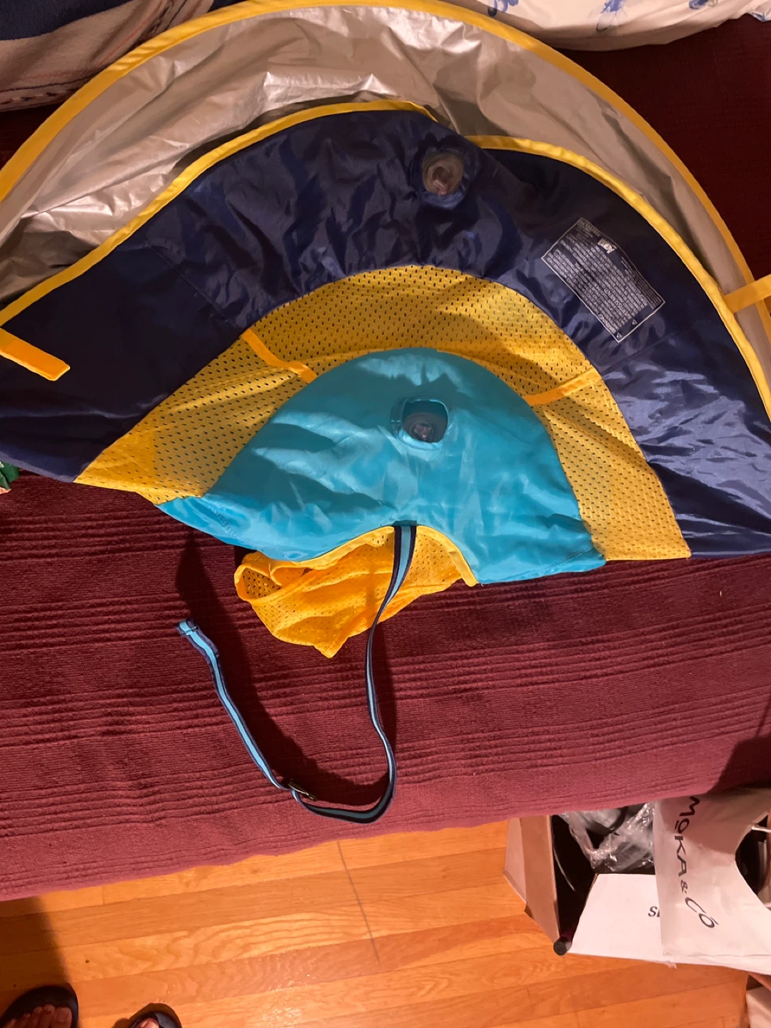 This is a SwimSchool inflatable baby boat with a canopy. It is in good condition and ready for your little one to enjoy some time in the water. It features a comfortable seat and a sunshade canopy to protect your baby from the sun. Great for introducing your baby to the water in a safe and fun way!