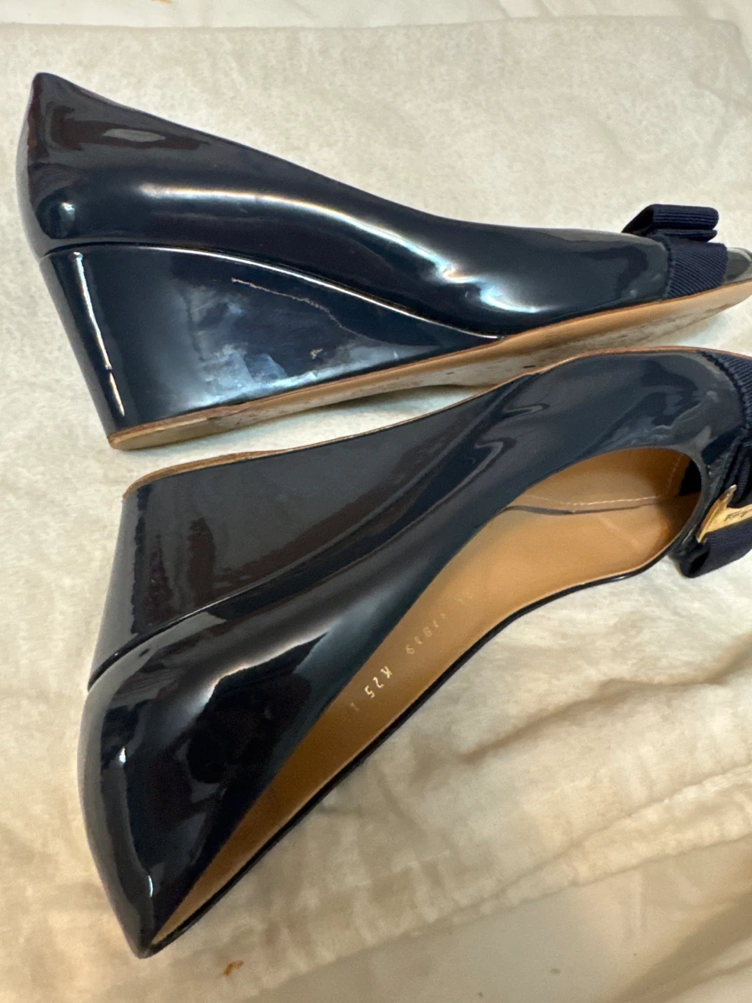 Selling a pair of Salvatore Ferragamo Vara Bow pumps in a classic navy colour. These stylish shoes are in great condition and feature the iconic Vara bow detail. They are marked as size 9