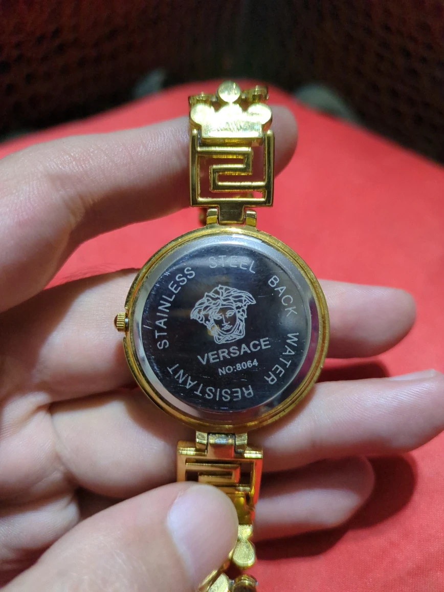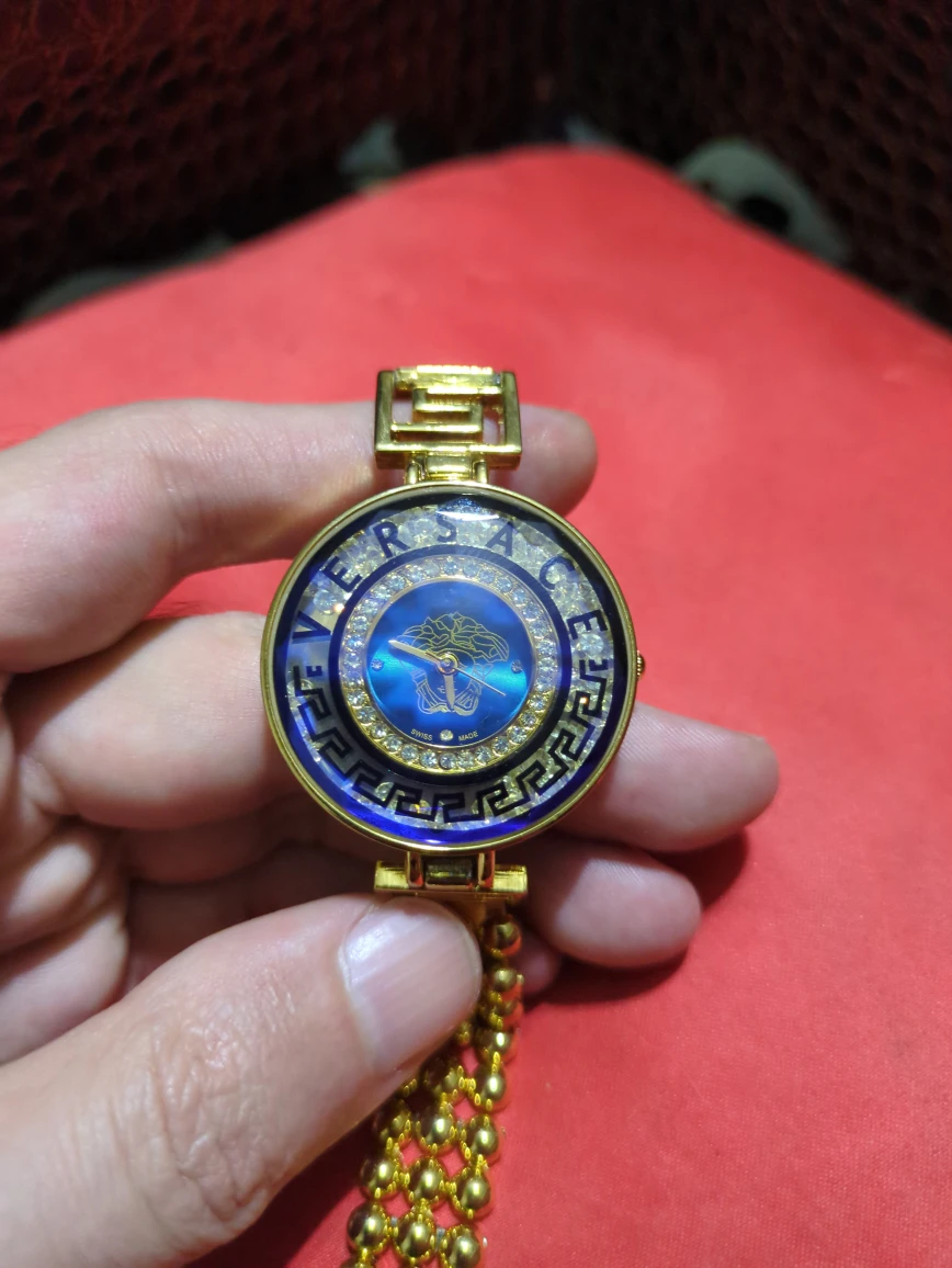 Selling a beautiful Versace ladies watch! It features a gold-tone finish with a stainless steel back. The face has a unique design, and the band is also gold-tone. Perfect for adding a touch of elegance to any outfit