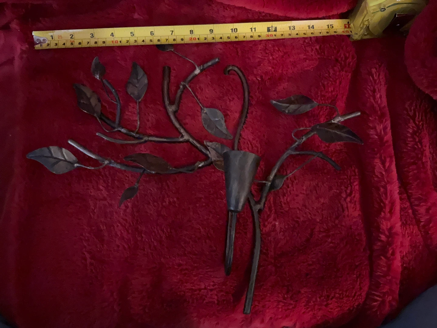 Here's a metal leaf wall sconce candle holder! It's a beautiful piece that will add a touch of nature to any room. It measures about 15 inches in length.