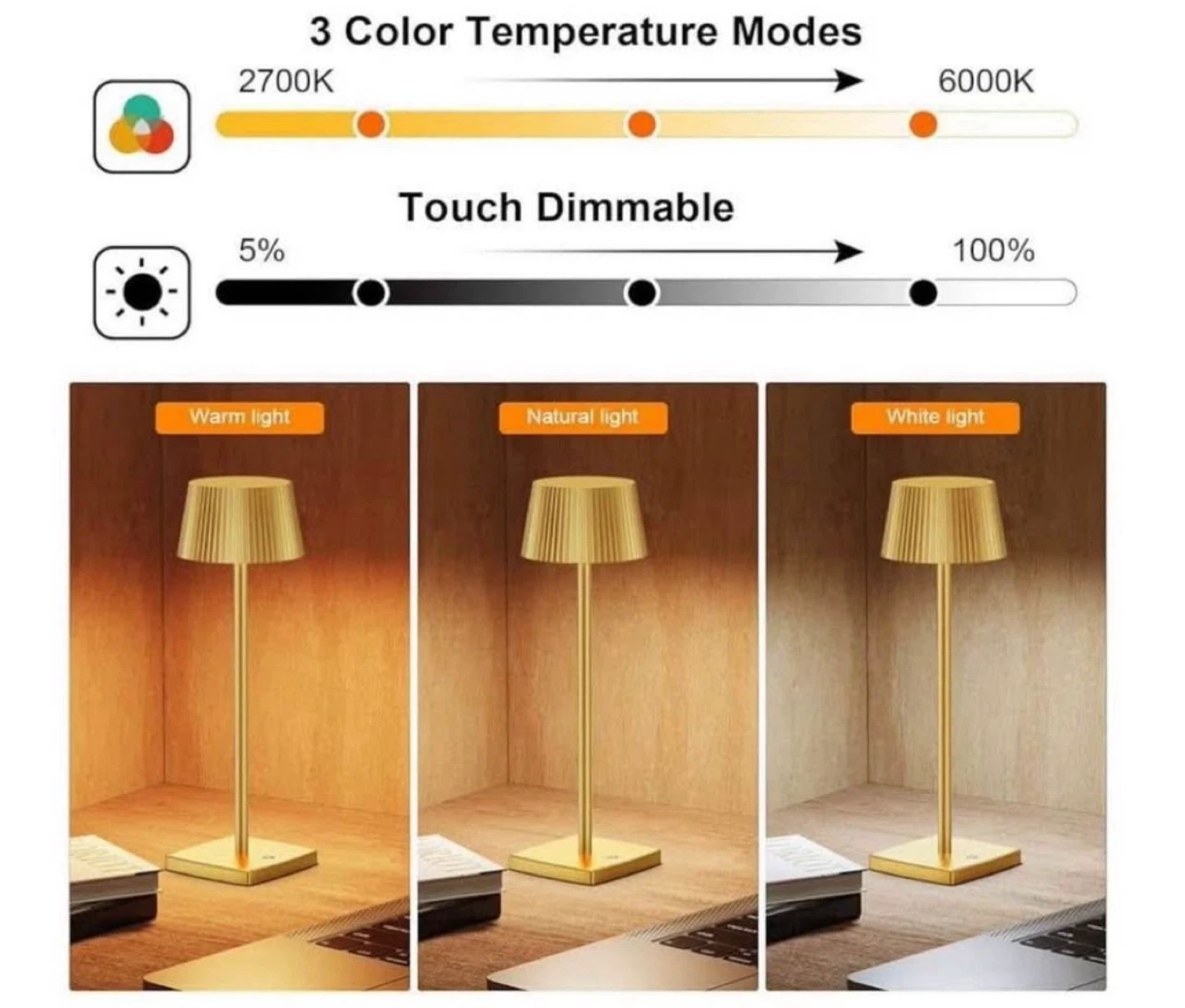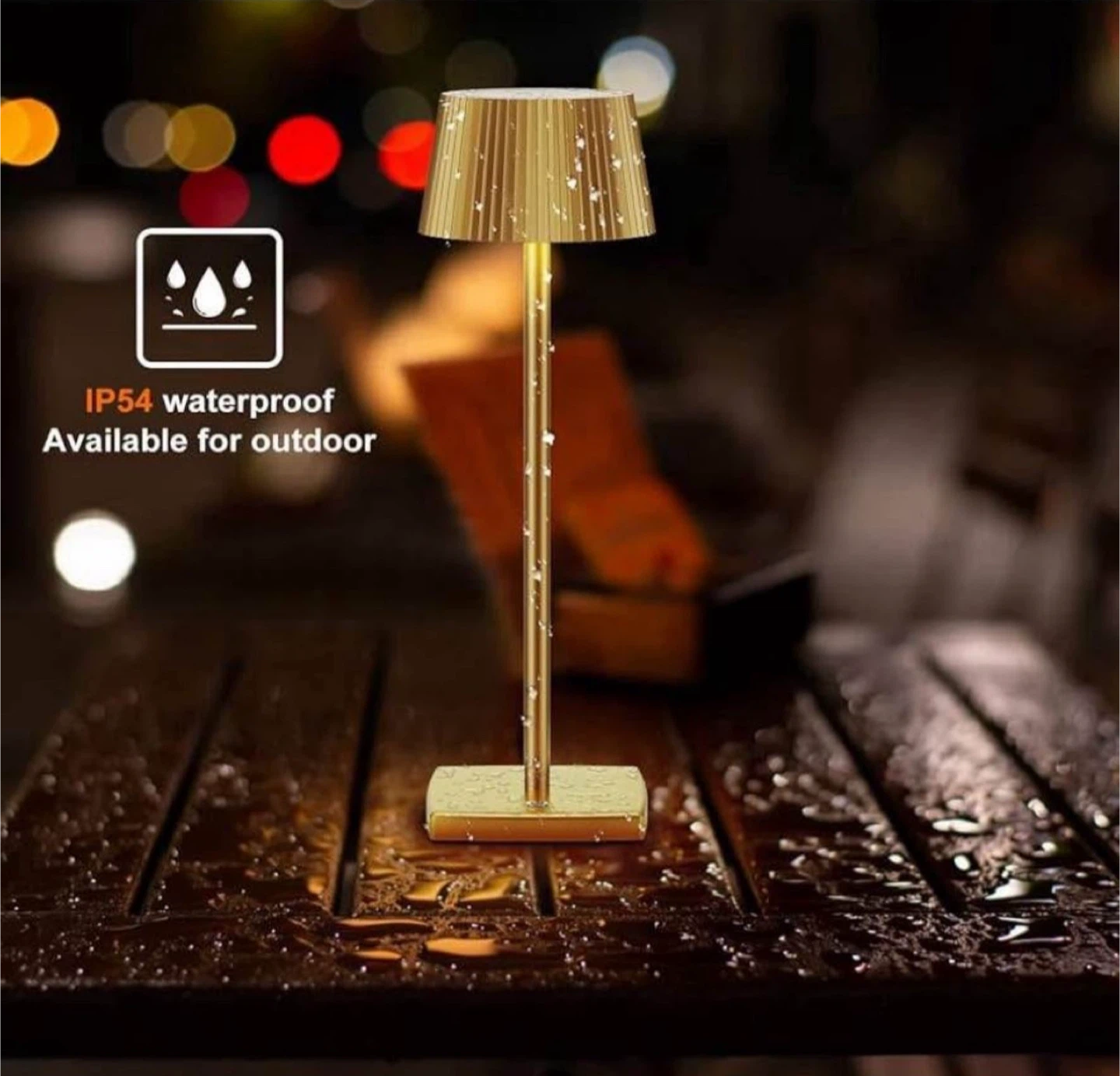This cordless LED table lamp is perfect for adding a touch of elegance to any room! It features three color temperature modes and is touch dimmable. It's also IP54 waterproof, making it suitable for outdoor use