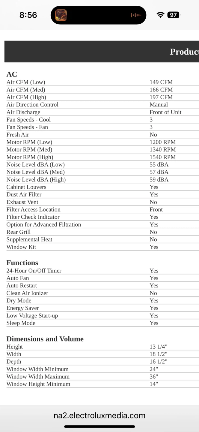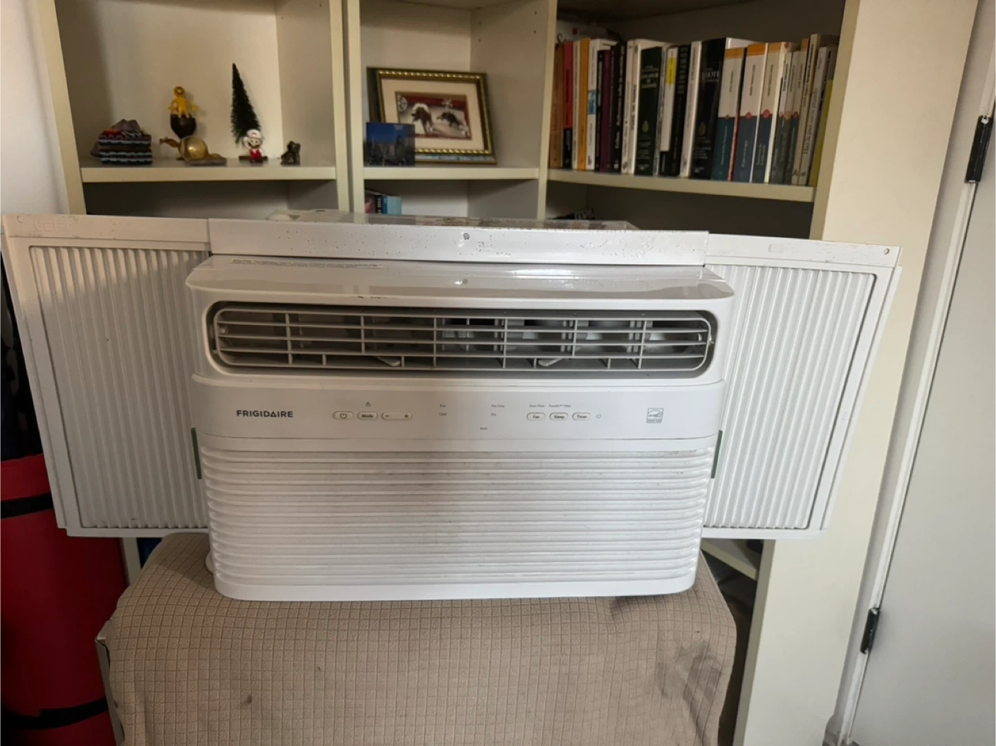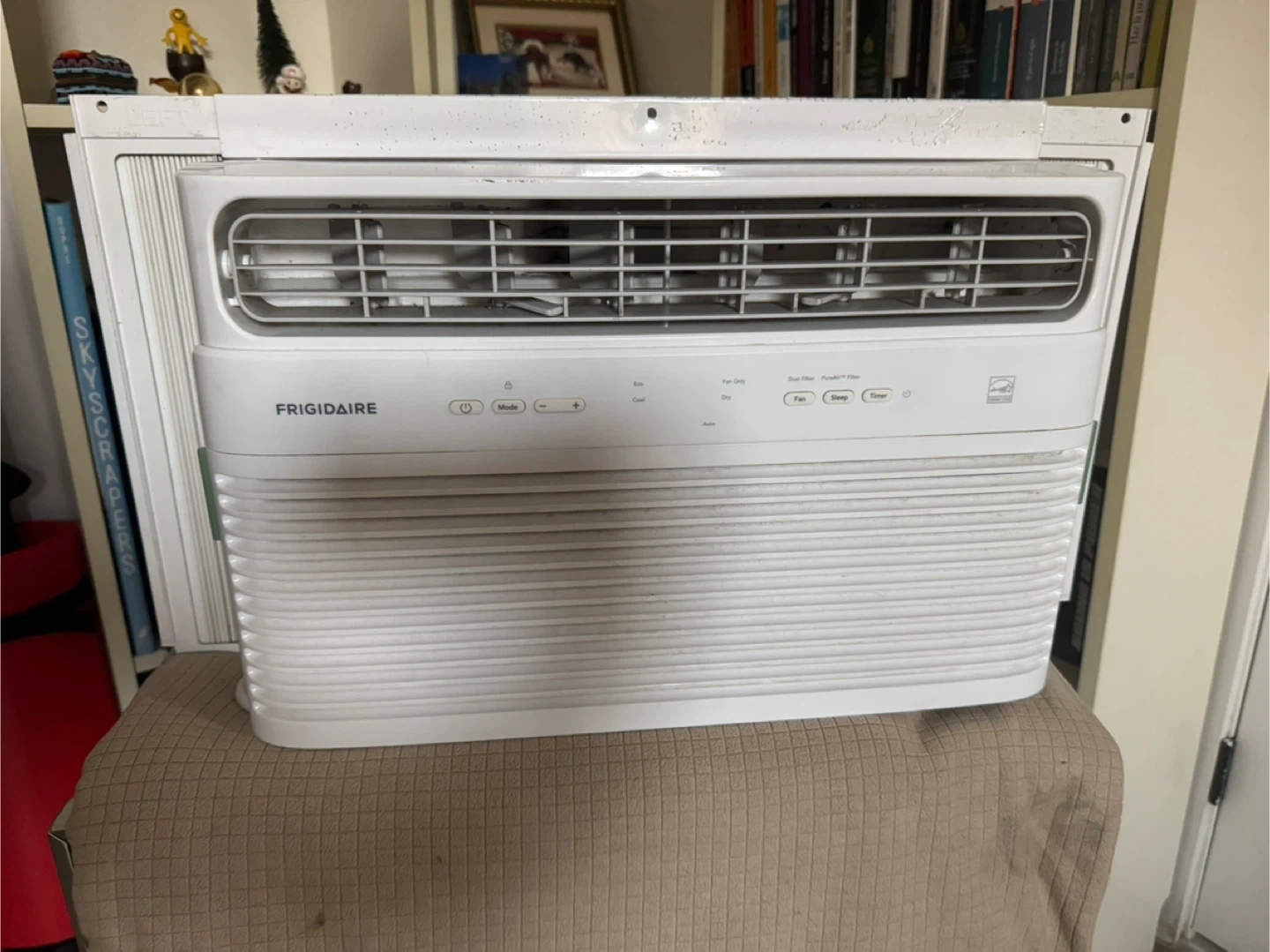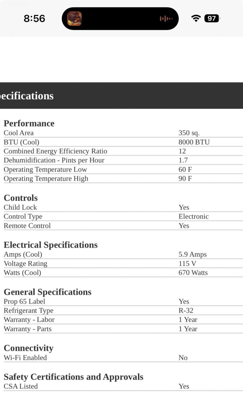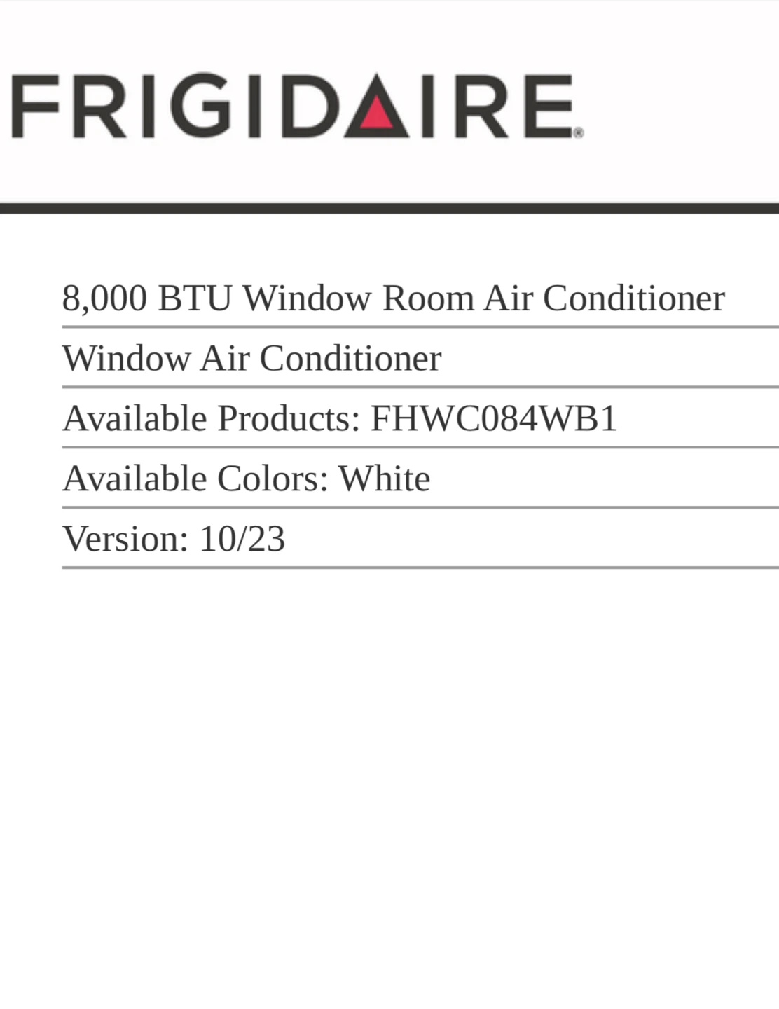 Selling a Frigidaire 8,000 BTU Window Room Air Conditioner in white. It's a window air conditioner with the model number FHWC084WB1. The dimensions are: Height 13 1/4", Width 18 1/2", and Depth 16 1/2". It has a cool area of 350 sq. ft and a combined energy efficiency ratio of 12. It also features a remote control and an auto restart function.