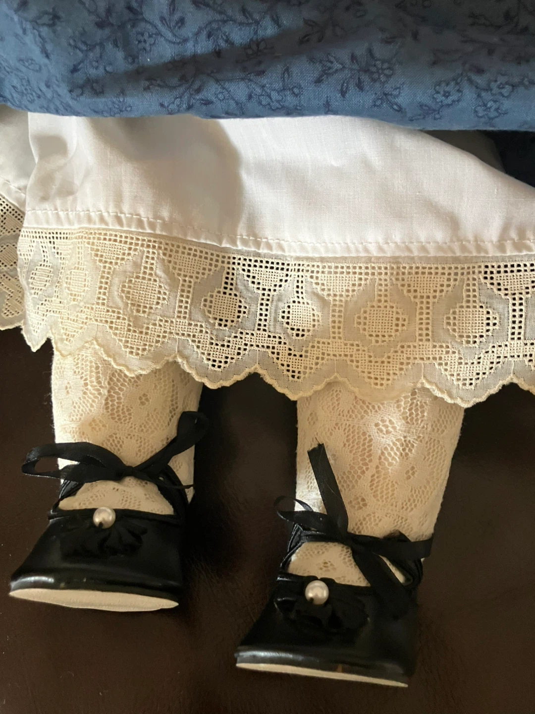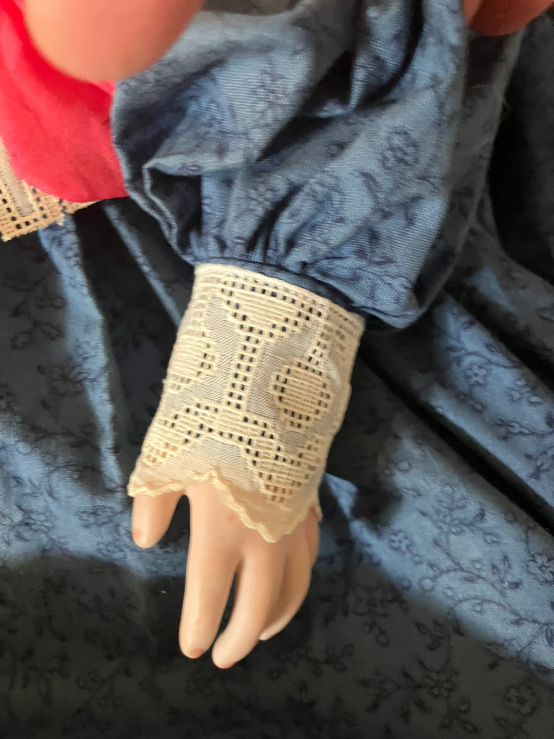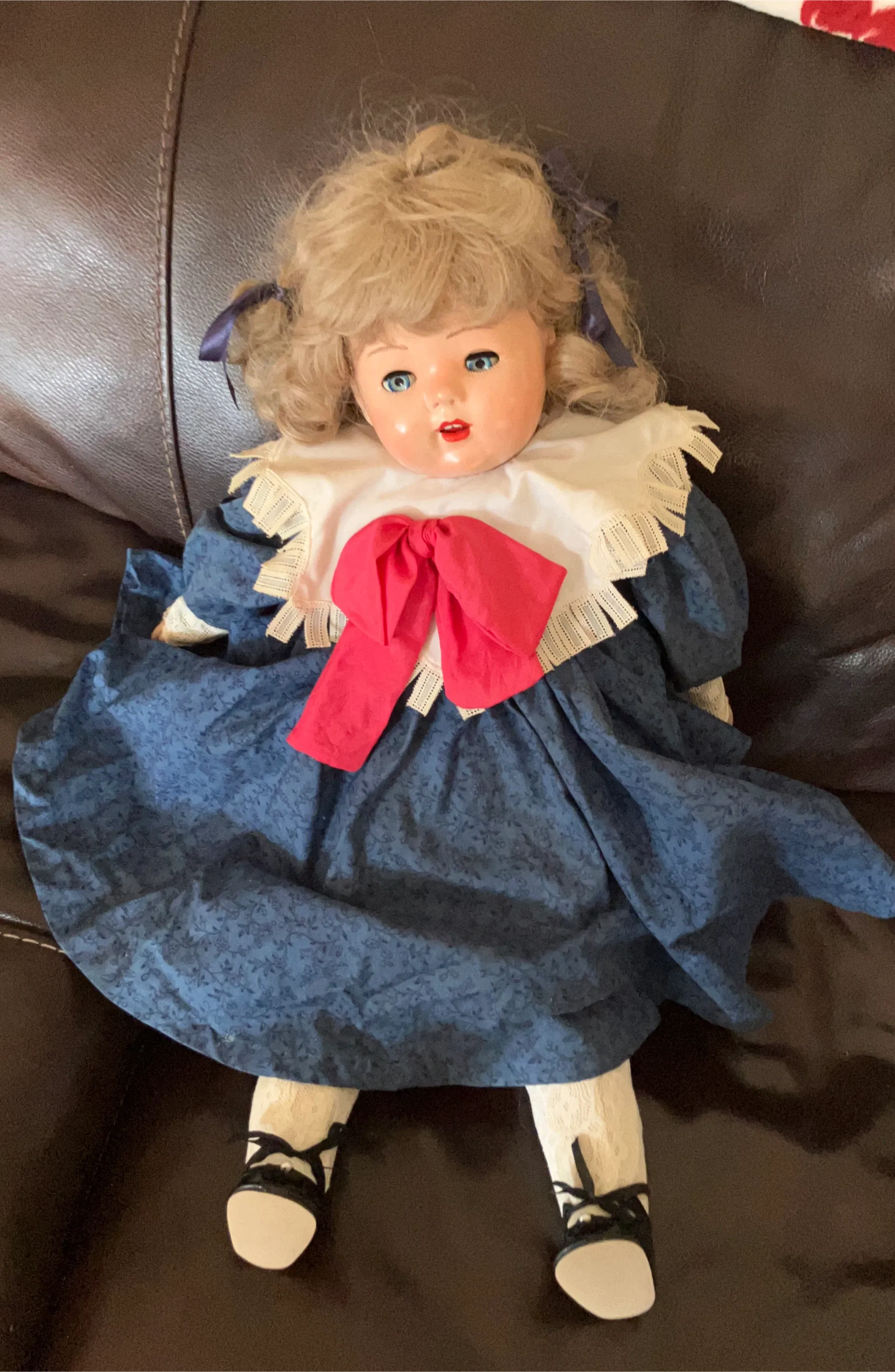 This is an antique doll (1940’s)with blonde curly hair and blue eyes.