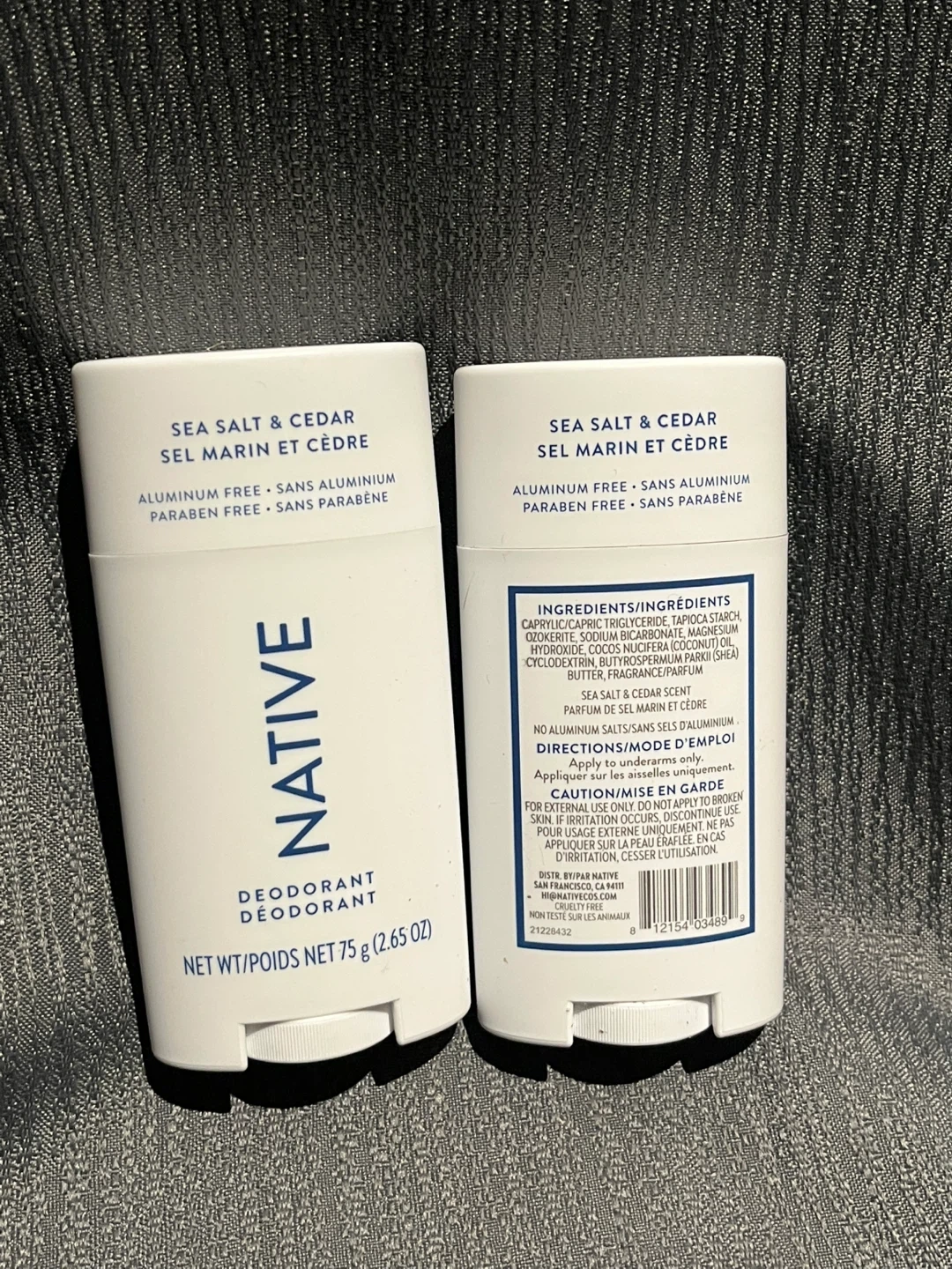 Selling two Native deodorants in the Sea Salt & Cedar scent. Each deodorant is 75g (2.65 oz), aluminum-free, and paraben-free. Perfect for everyday use!