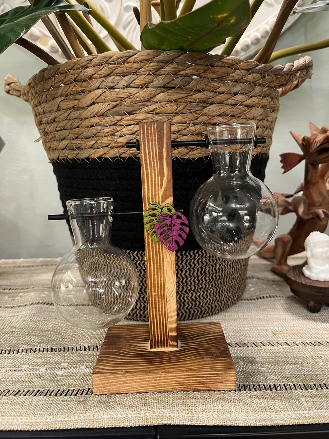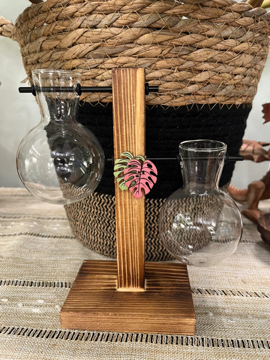 Lovely double glass propagation stations, perfect for growing plants from cuttings or displaying cut flowers. It includes two glass vases and a wooden stand with monstera leaf detail