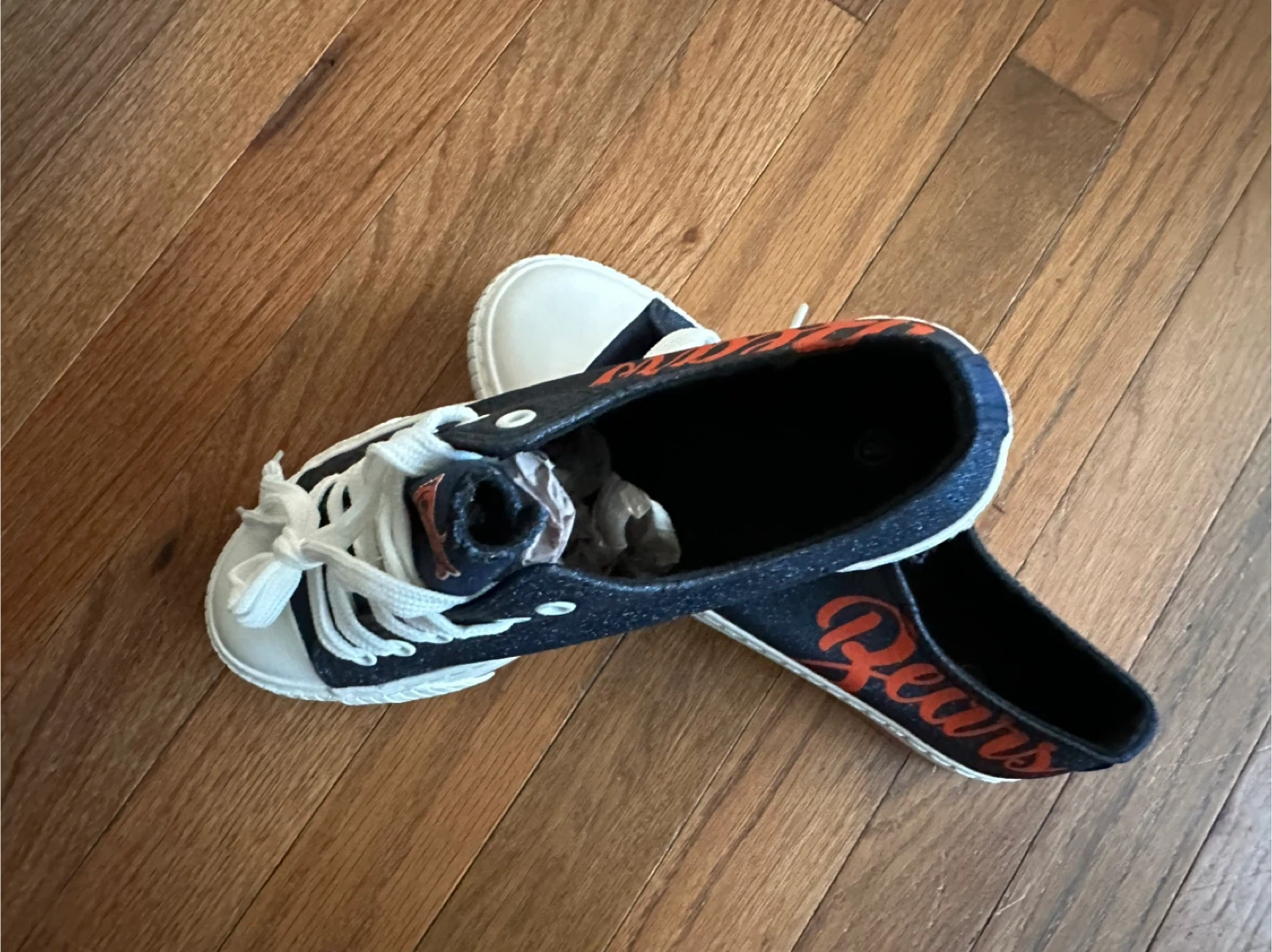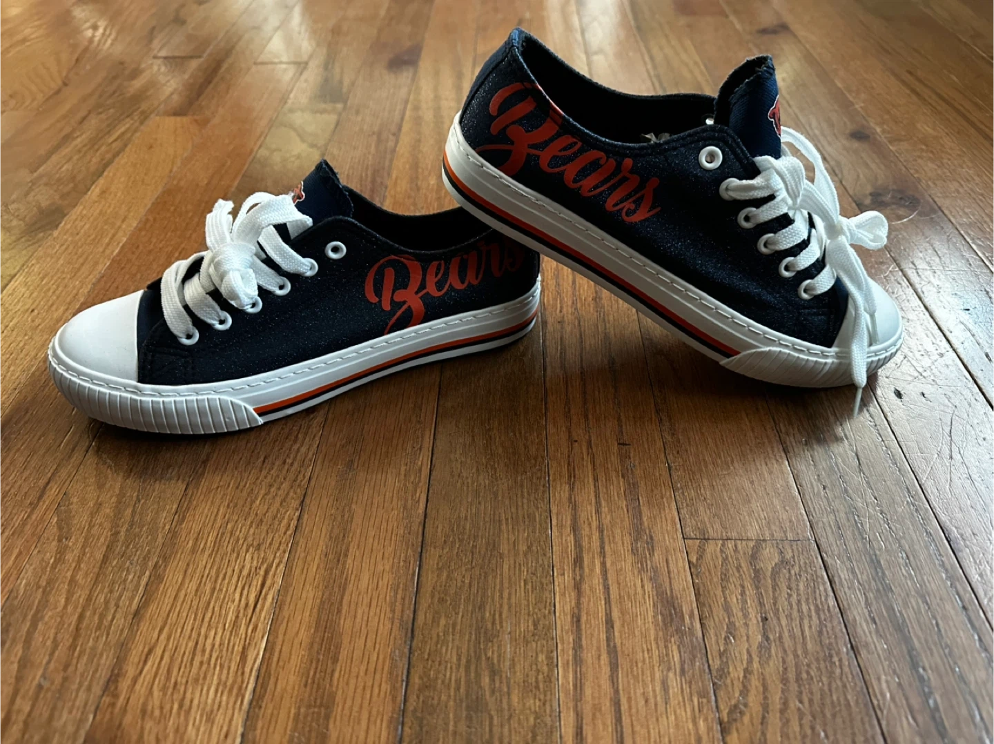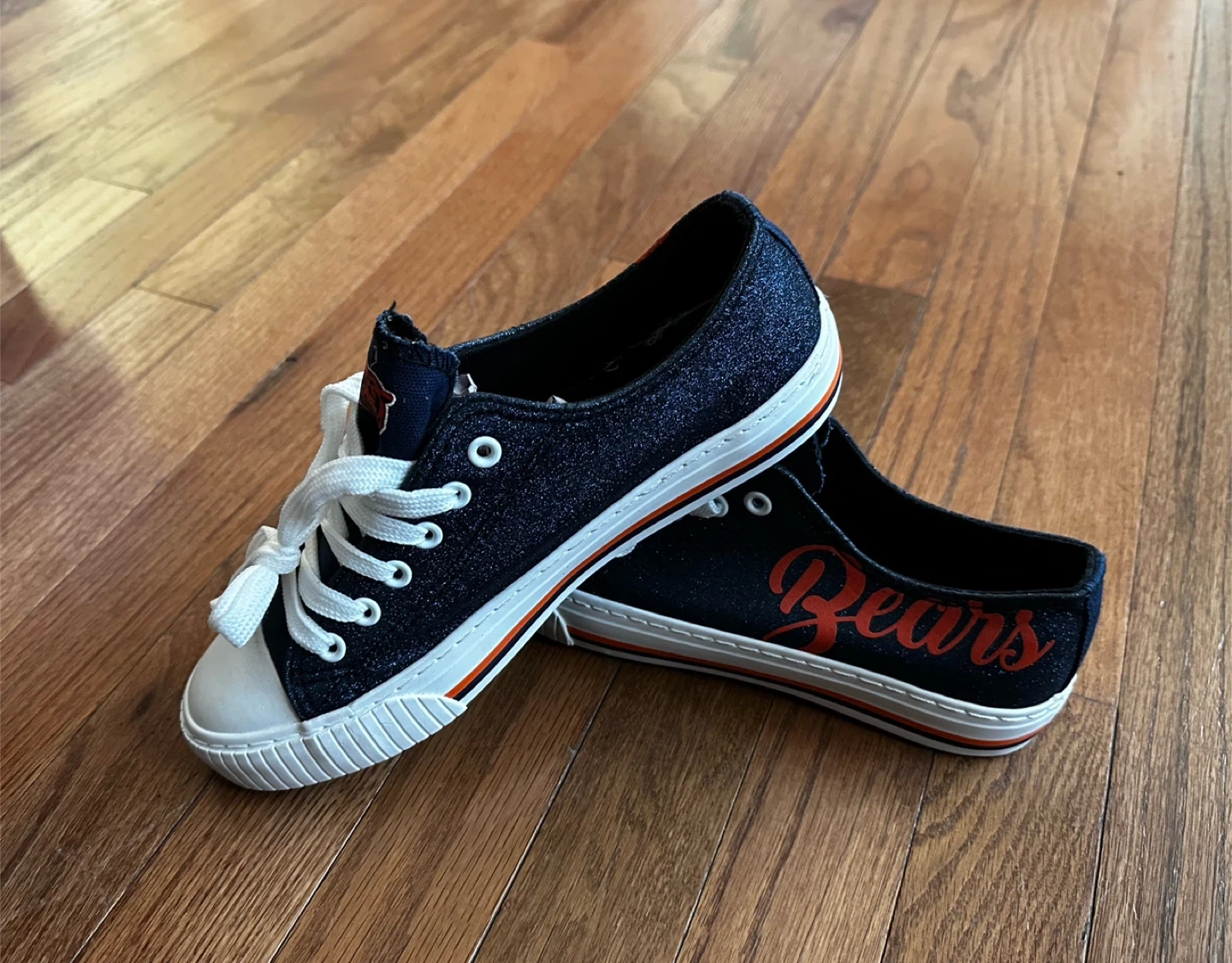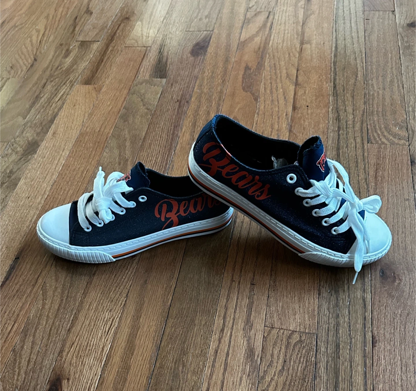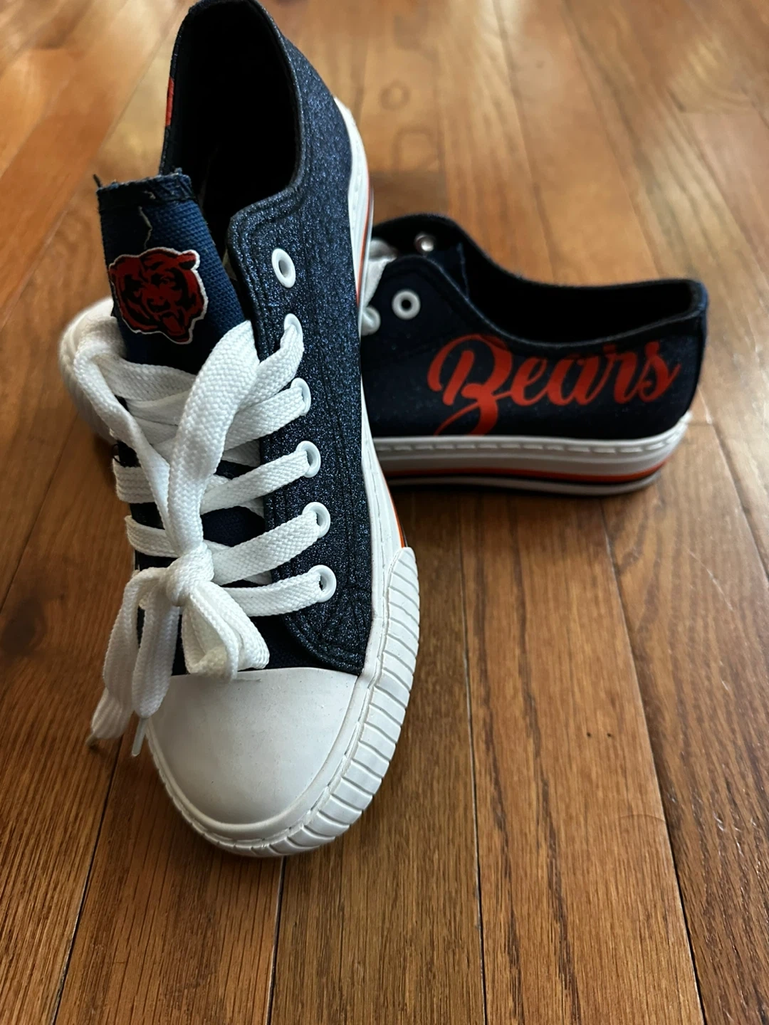 Cute Chicago Bears sneakers! They are navy blue with orange accents and the word "Bears" written on the side. Perfect for showing your team spirit!