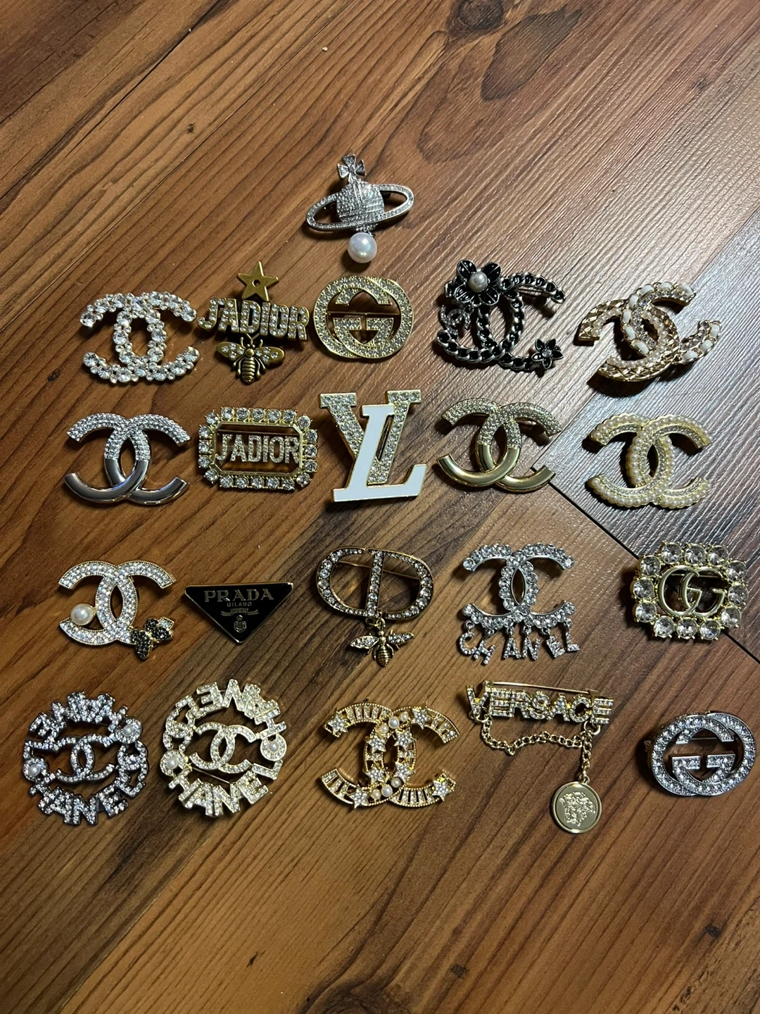 Selling a collection of designer brooches! You'll find iconic logos from Chanel, Louis Vuitton (LV), Yves Saint Laurent (YSL), Dior, and more. These are perfect for adding a touch of luxury to any outfit or accessory. All have logo on the back. Message for more info.