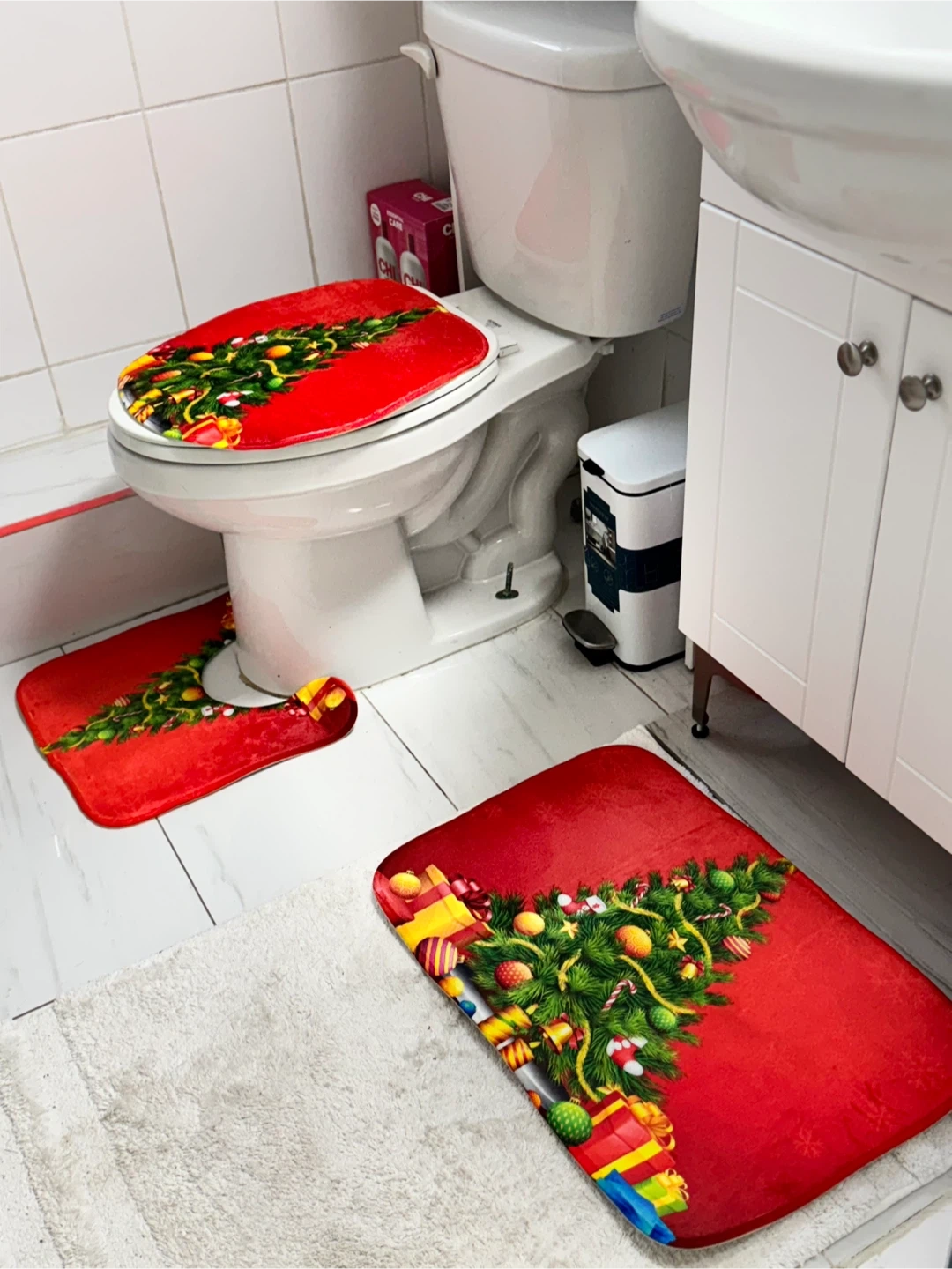 Get into the holiday spirit with this festive Christmas toilet seat cover and bath mat set! It's perfect for adding a touch of Christmas cheer to your bathroom. The set includes a toilet seat cover and a matching bath mat, both featuring a vibrant Christmas tree design. Brand new and ready to use!