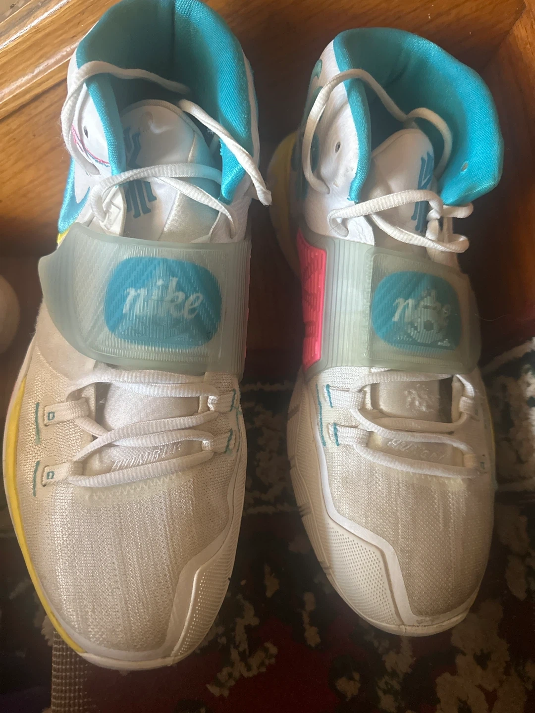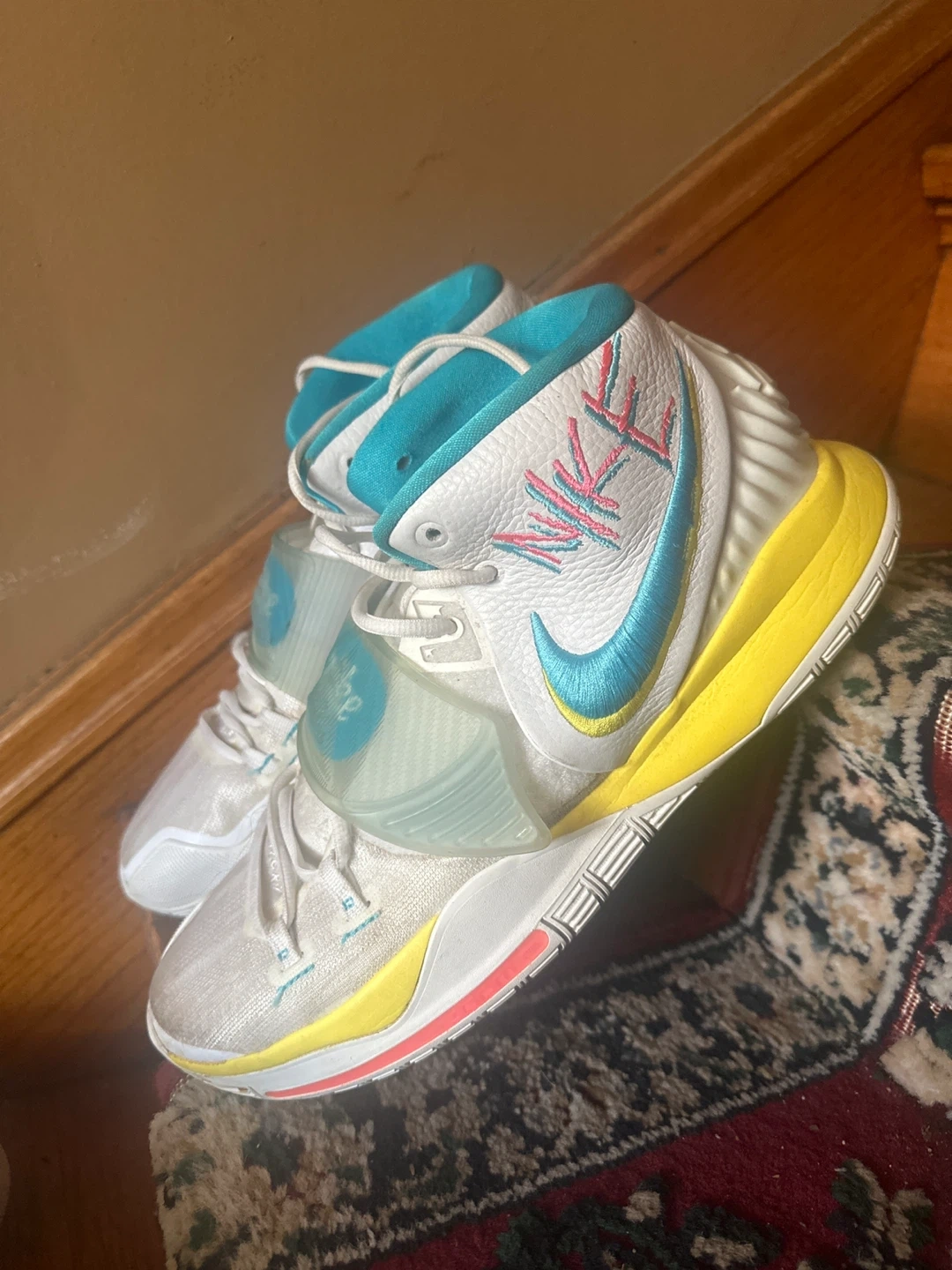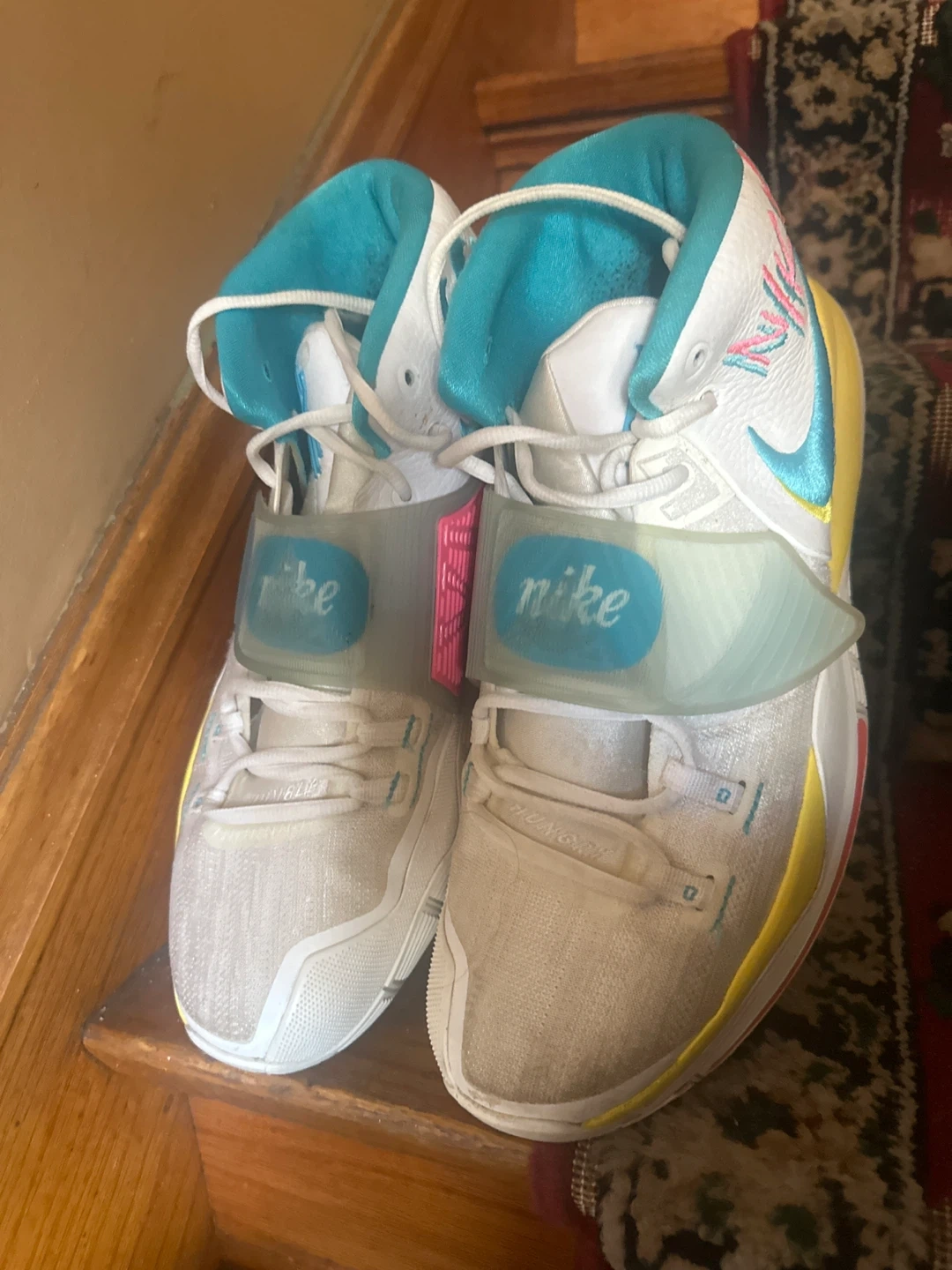 Selling a pair of Nike Kyrie 6 basketball shoes. They feature a white, turquoise, and yellow color scheme. Perfect for playing ball or casual wear!