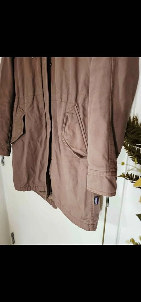 Warm and stylish Patagonia Prairie Dawn Insulated Parka, in a taupe beige/ light brown. A workwear inspired look from the legendary sustainable and eco-friendly outdoors brand. Jacket has a light blue and mustard/ ochre geometric patterned contrast lining. Patagonia logo embossed on snap buttons, and logo tag on bottom left side.