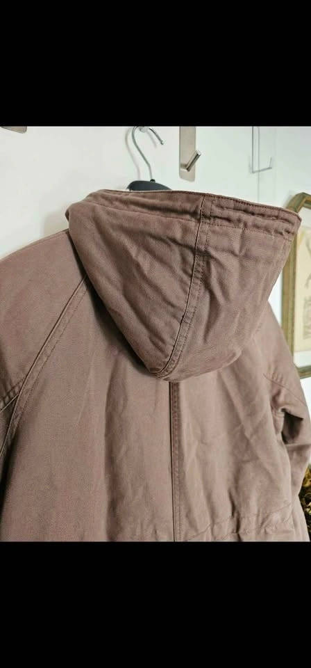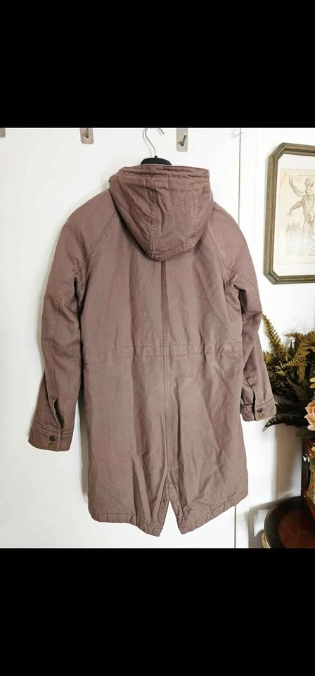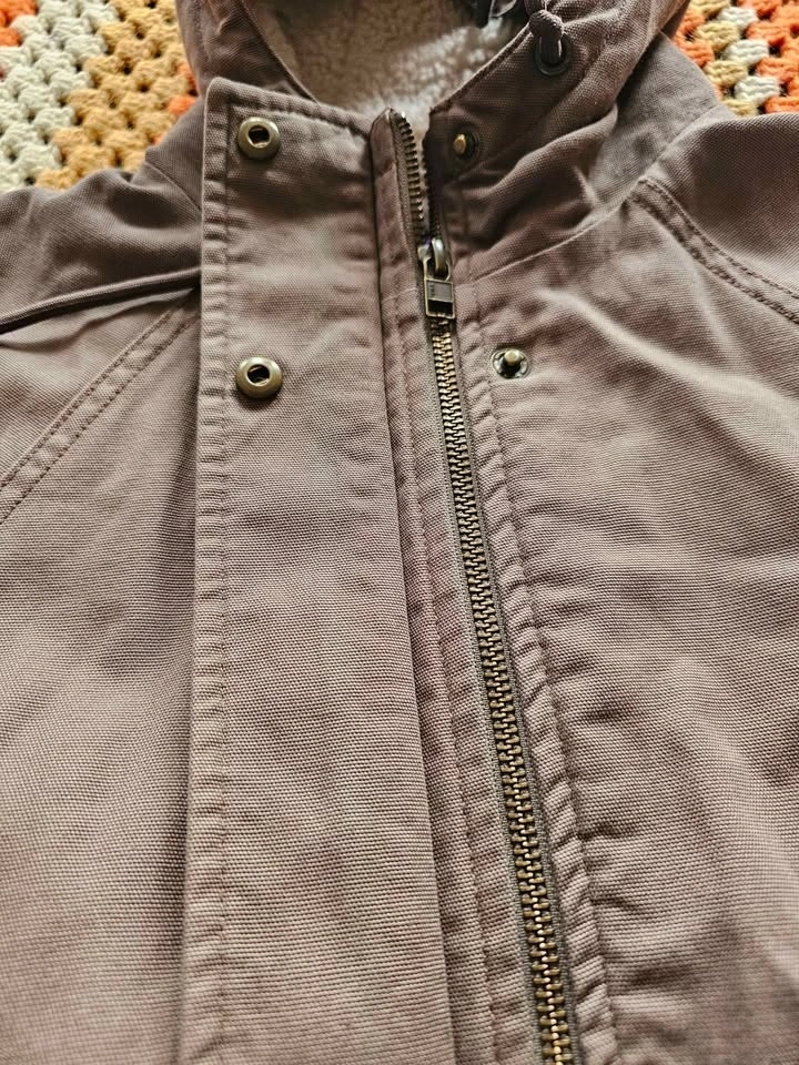Jacket is in very good used condition and is a women's size Small. It has light signs of wear to the inner lining and a bit of fading on the flap covering the zipper, on the inner surface where it rubbed against the zipper - see last photo.