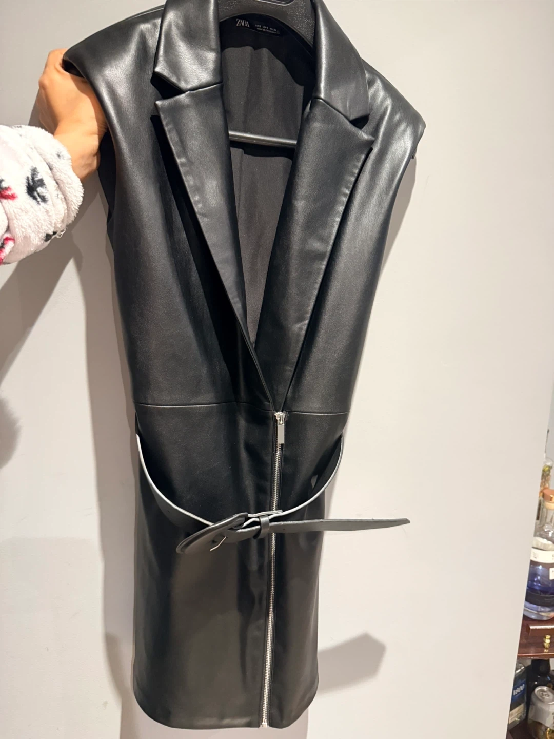 Selling a stylish Zara faux leather dress in black. It features a belted waist and a zipper closure. Great for a night out!