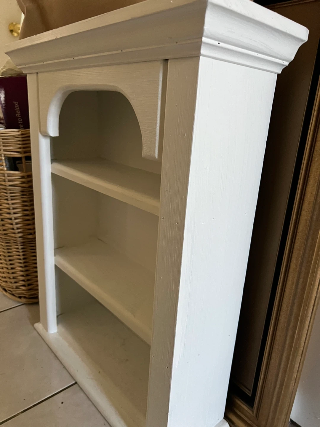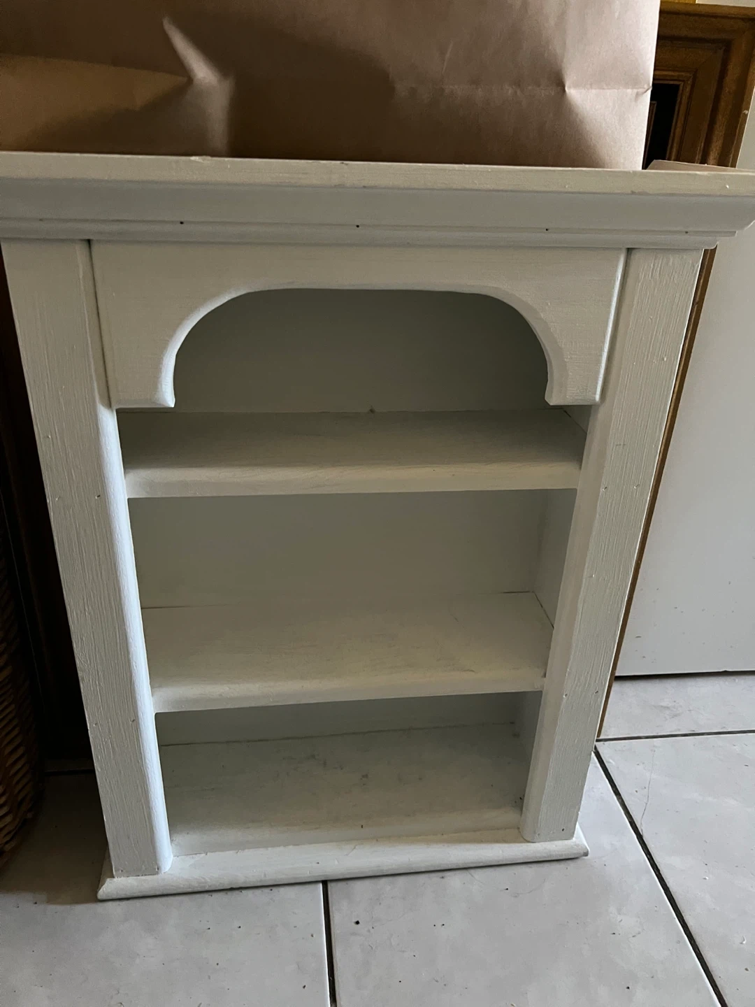 Here's a cute white wooden shelf, perfect for adding some storage or display space to any room! It's in good condition and ready for a new home