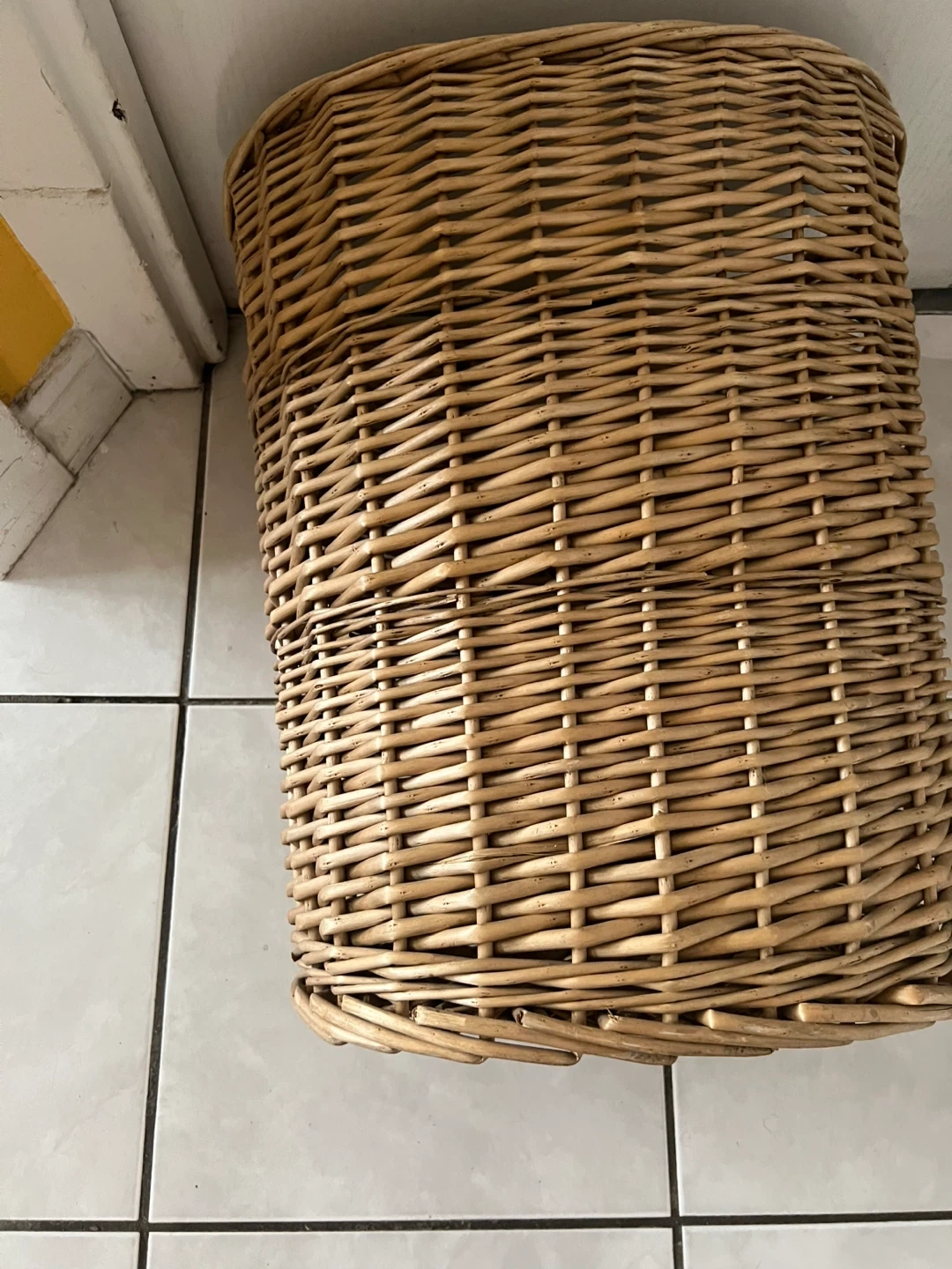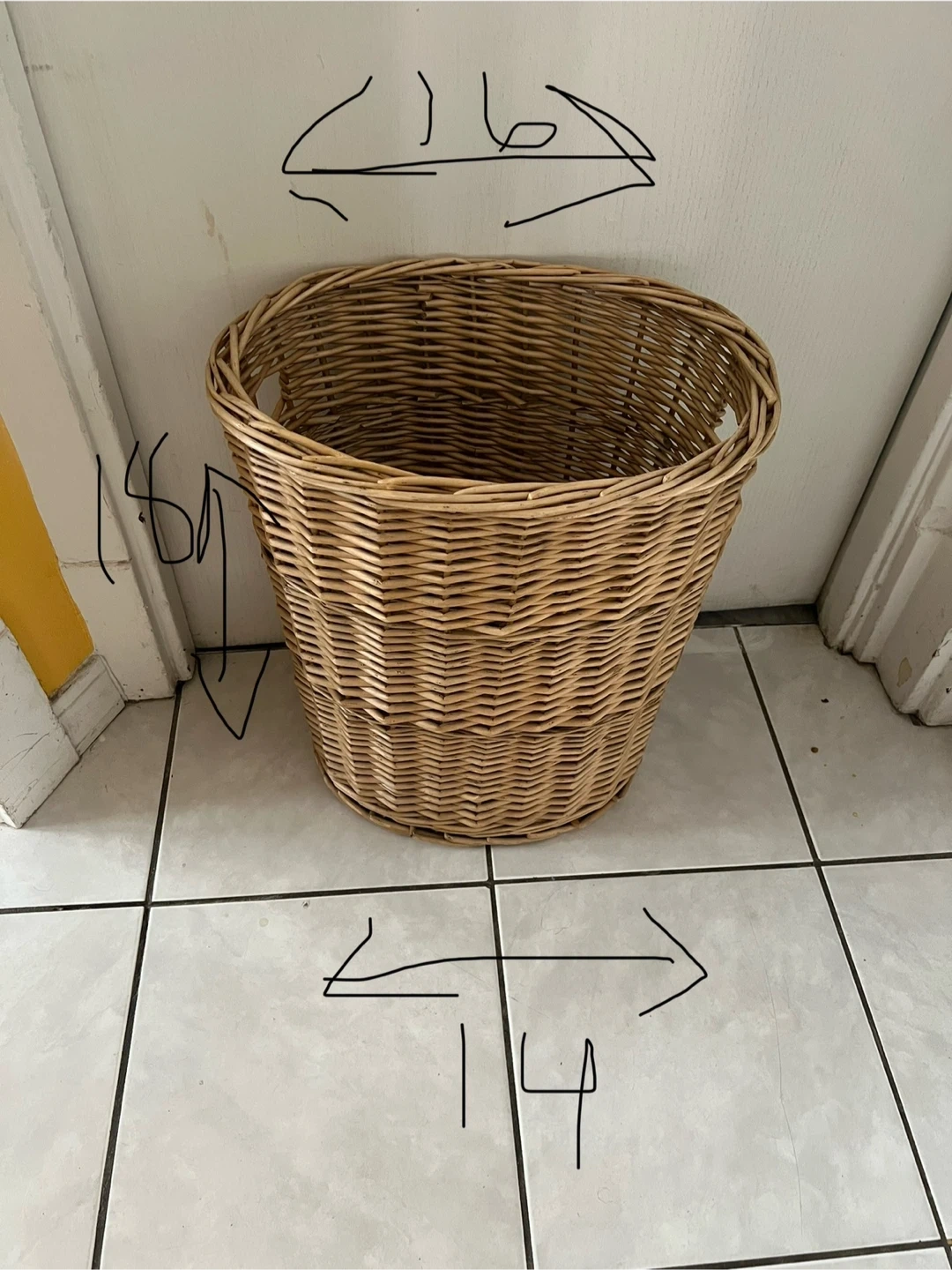Selling a wicker basket, perfect for storage or decor! It measures approximately 16 inches in height and 14 inches in diameter.