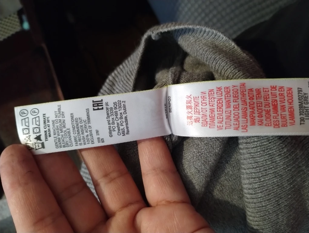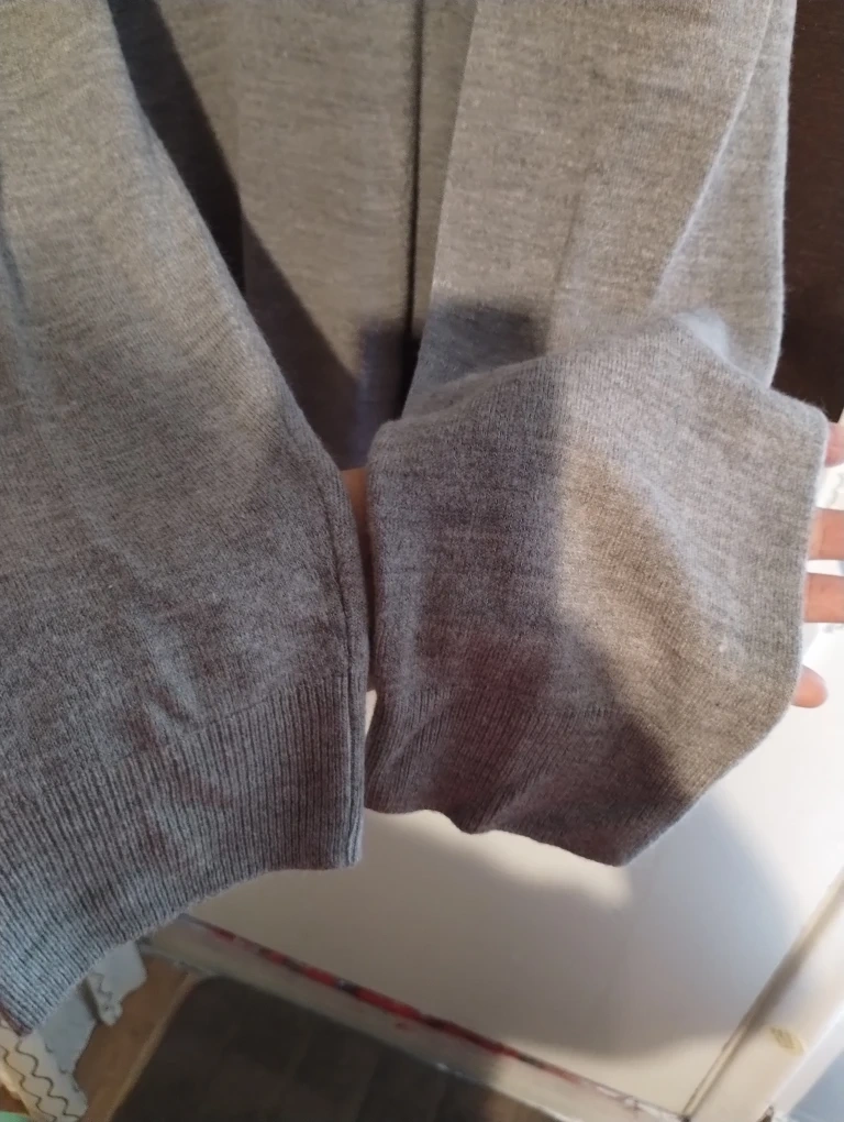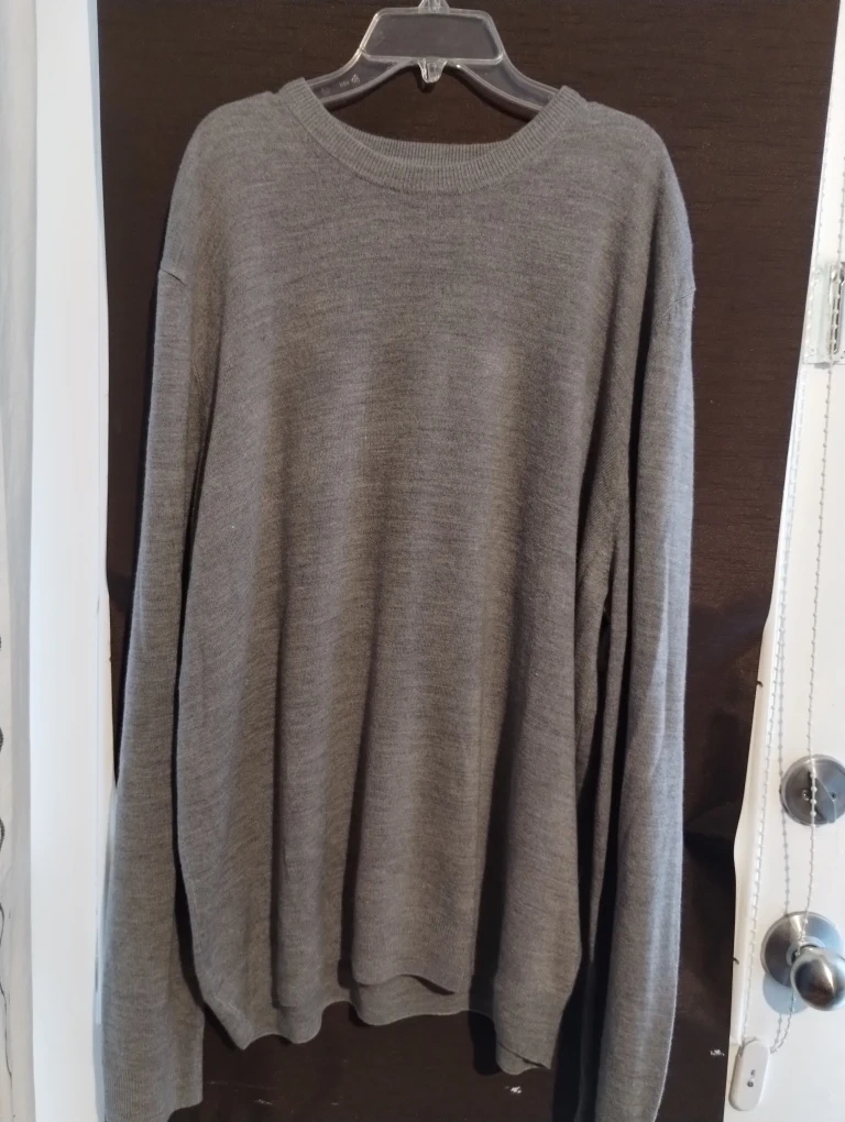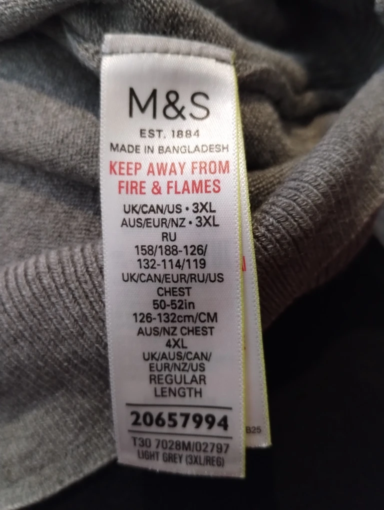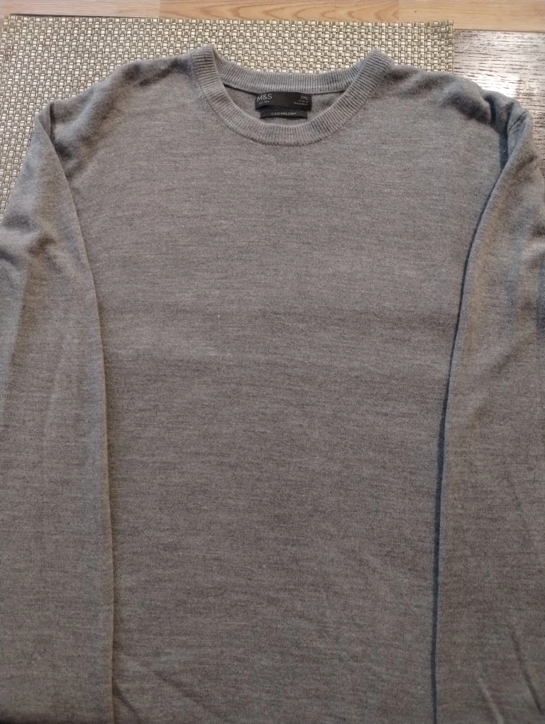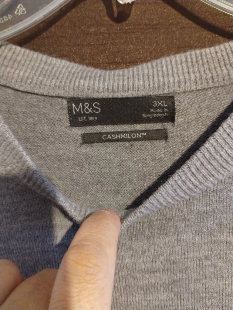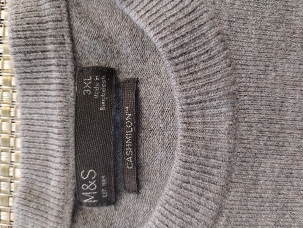 Here's a comfy M&S Cashmilon sweater in light grey. It's a size 3XL and made in Bangladesh. The chest size is 50-52 inches. It's a regular length sweater