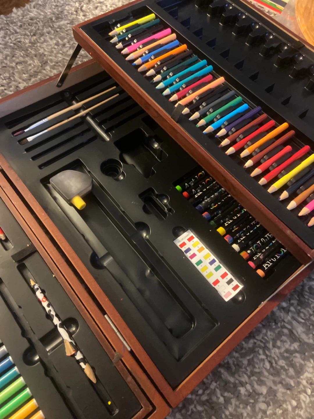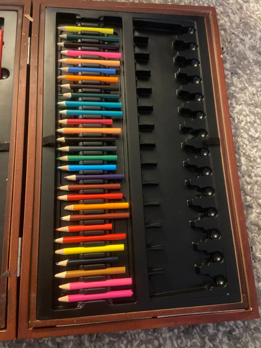 Selling a complete wooden art set. It includes a variety of pencils, crayons, and markers, all neatly organized in a wooden case. Perfect for any aspiring artist!