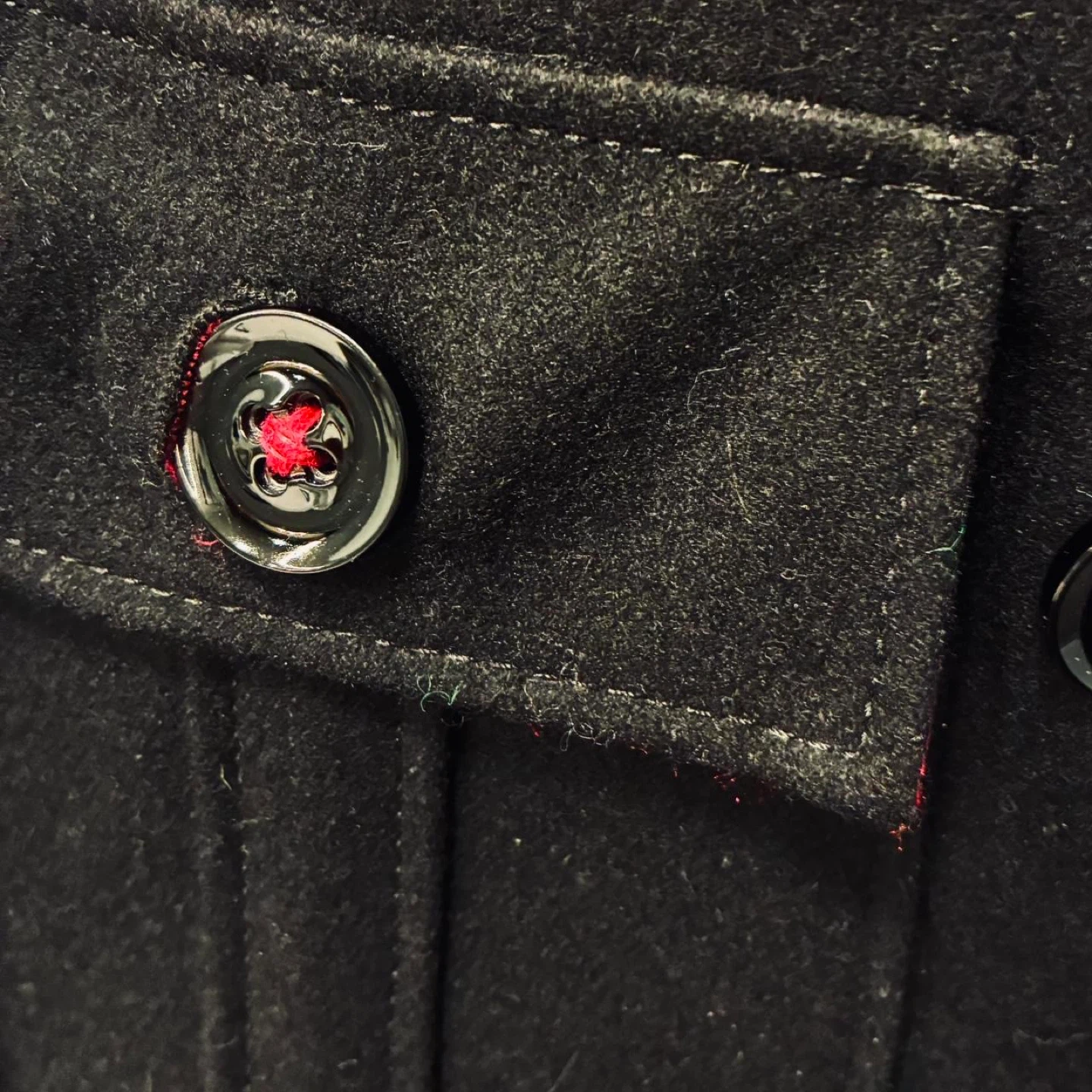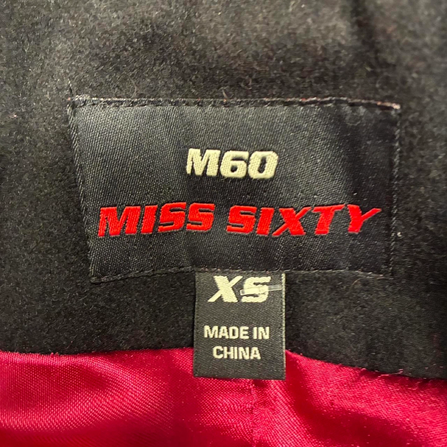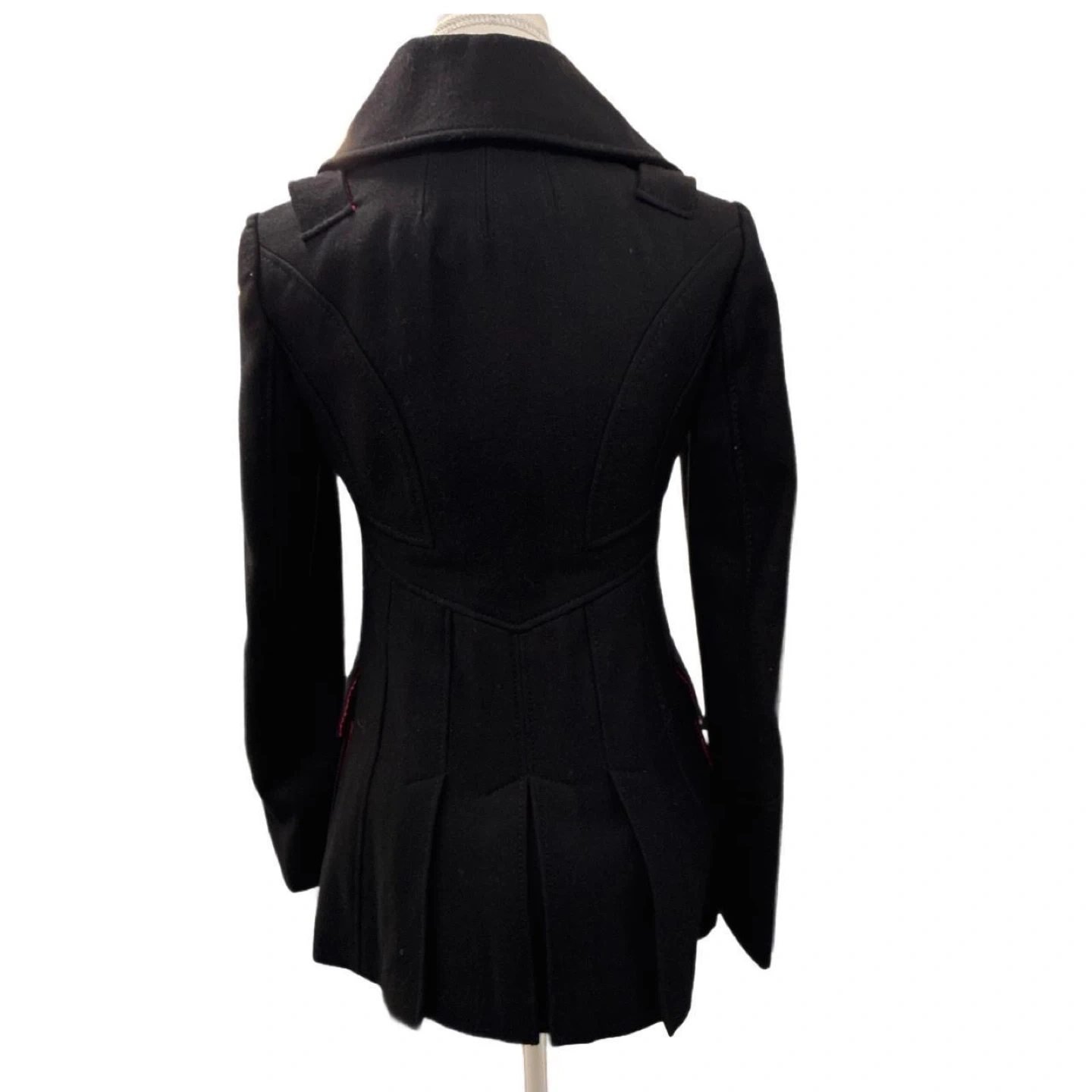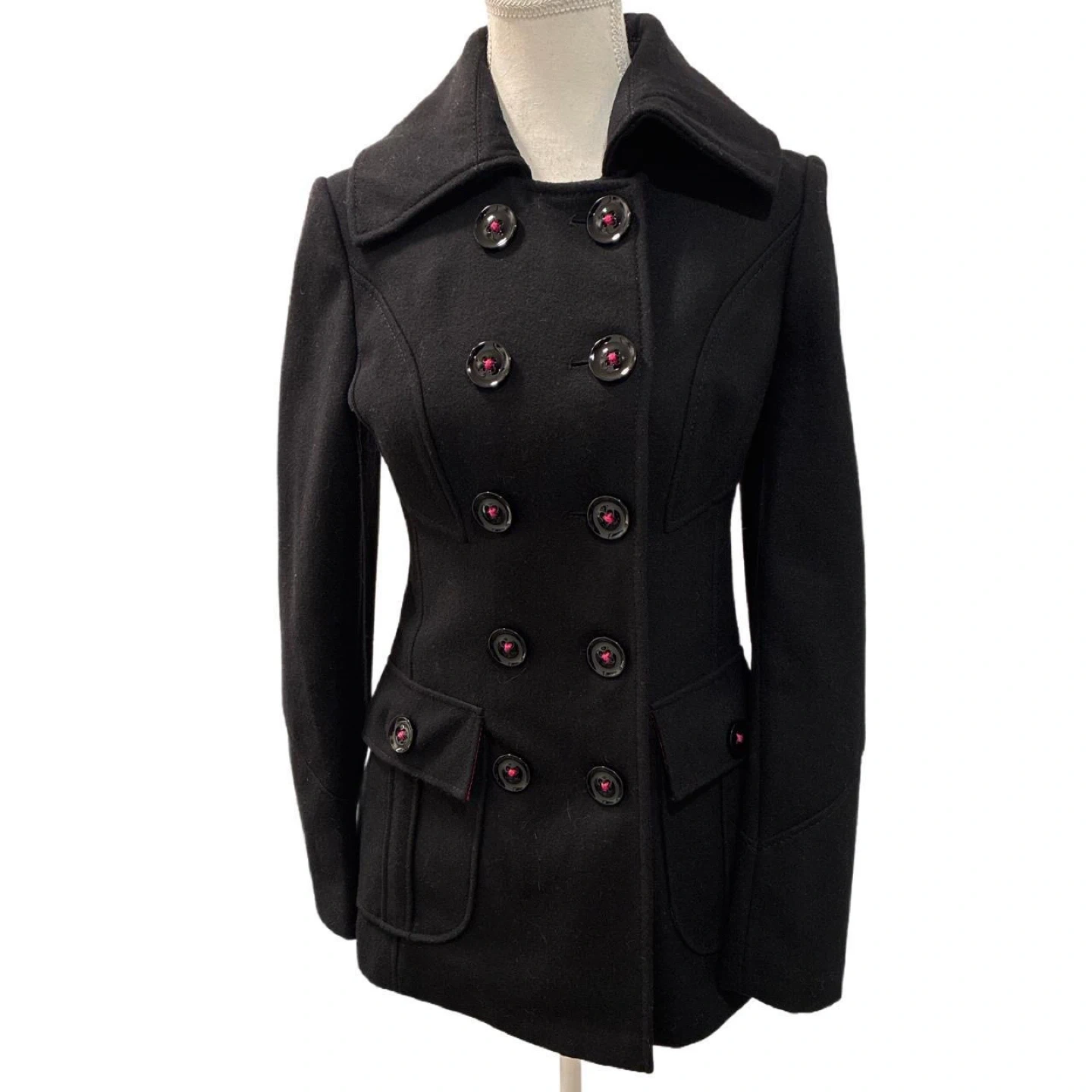 Y2k Miss Sixty Double-Breasted Black Pea Coat. Hot pink threading detail on buttons, hot pink lining and pleated back vent. 2000's