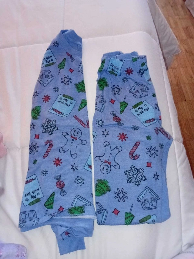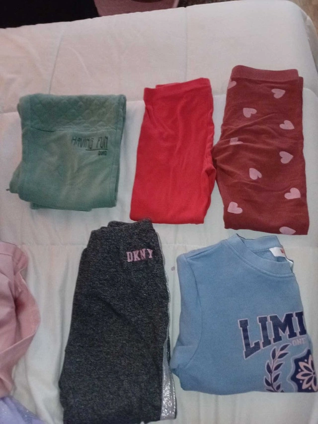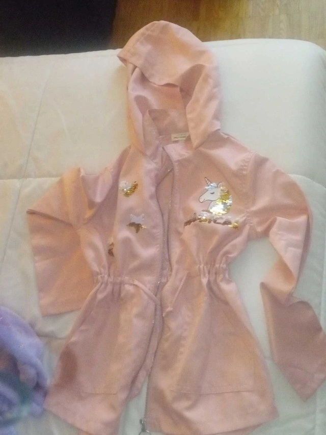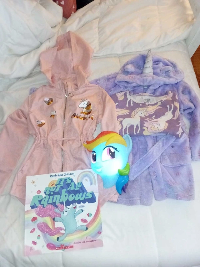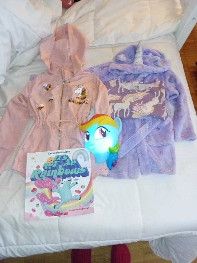 This is a bundle of girls clothing size 7-8, all in condition. It includes a variety of items BRAND NEW unicorn jacket ripped the tags off but never worn. Size 7 Unicorn robe Unicorn night light Unicorn book 4 pants 1 sweater size 7 Price$ 40 If taken together 4 pants 1 sweater One winter christmas pj's set perfect for your little one's wardrobe. I estimate the used value of these items to be between $10 each, looking at similar listings on Kijiji. Available? Absolutely! If you're reading this, then yes, the item is still up for grabs!
