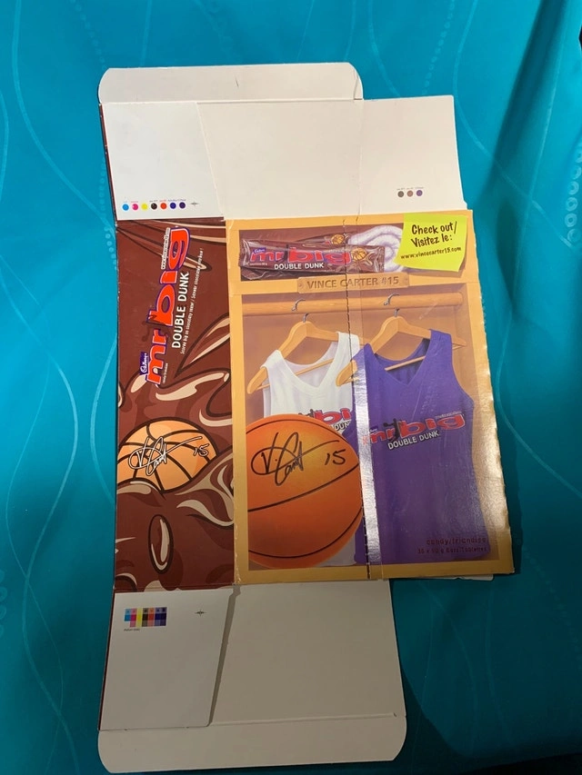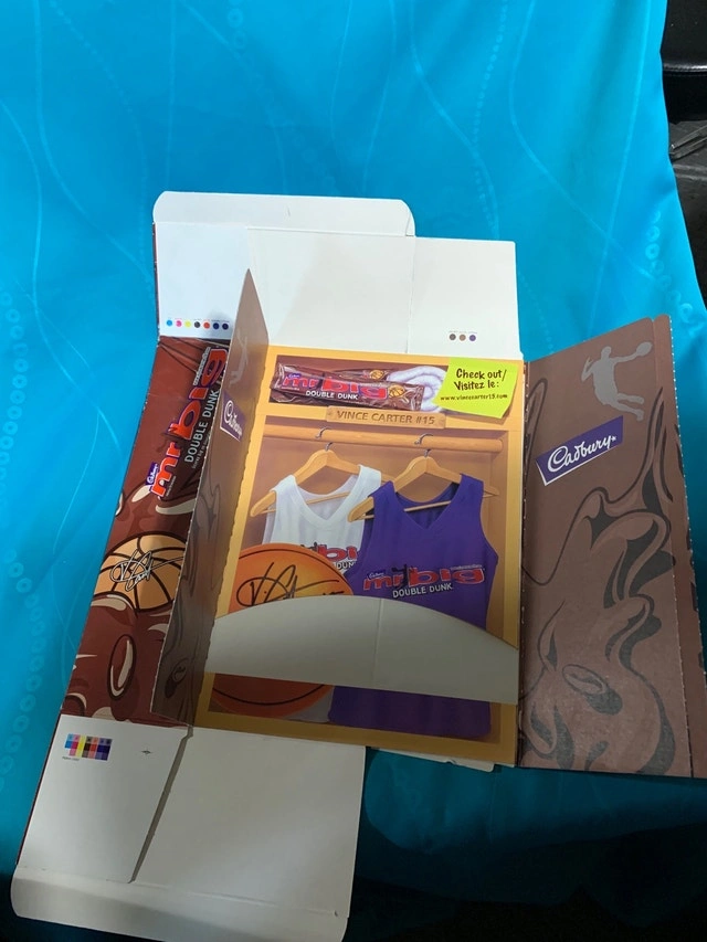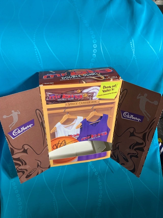 This is a very rare limited run Cadbury Mr Big product box. The promo was for a Vince Carter edition that the box looked like his dressing room and opened up to be used as a dispenser. No chocolate bars included. I have 3 to choose from.
