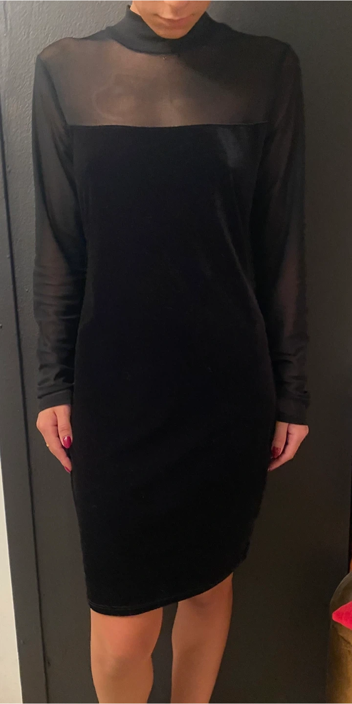 This is a stylish black dress featuring a combination of velvet and mesh materials. It has a mock neck and long sleeves. The dress appears to be in good condition and would be a great addition to your wardrobe!