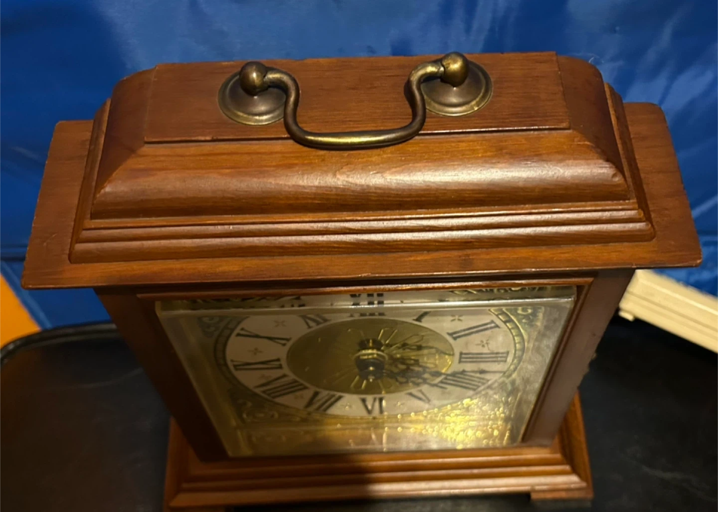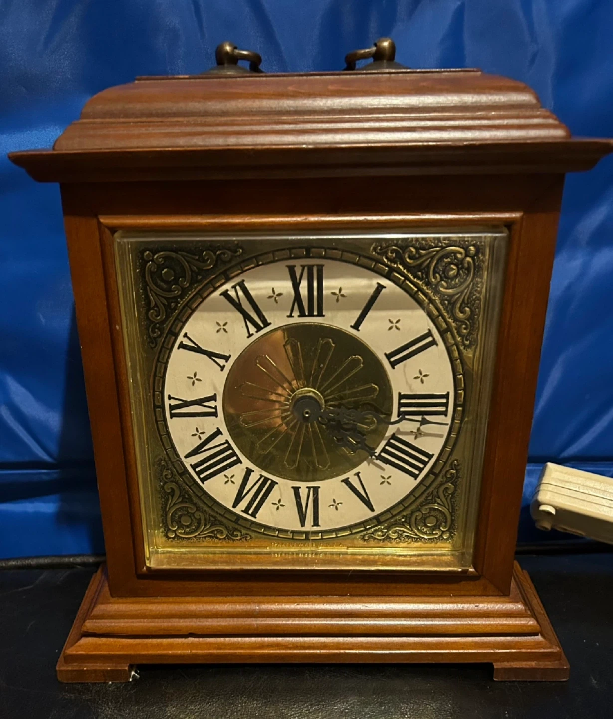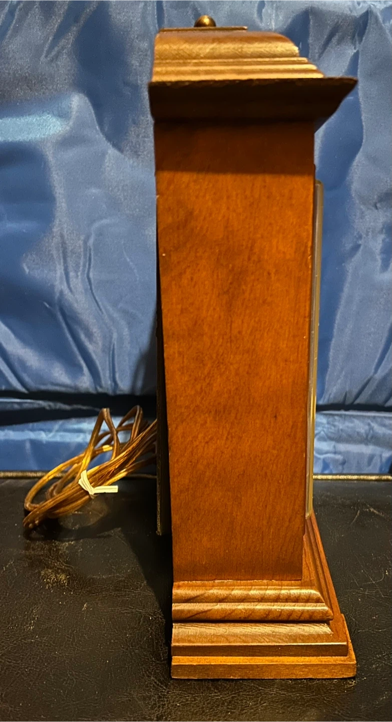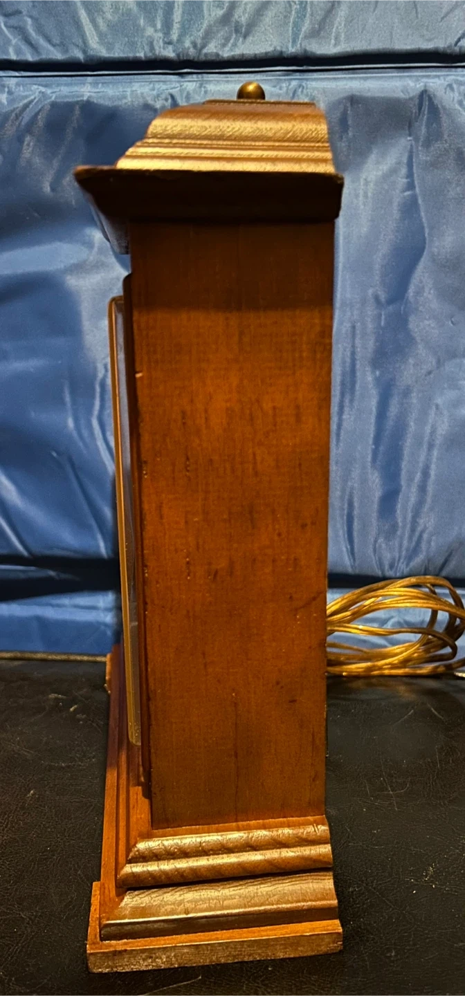 Here's a charming vintage wooden mantle clock that would look great on any shelf or table. It has a classic design with Roman numerals and a decorative face. The clock is in good condition and keeps time well. It's a lovely piece to add a touch of old-world charm to your home!