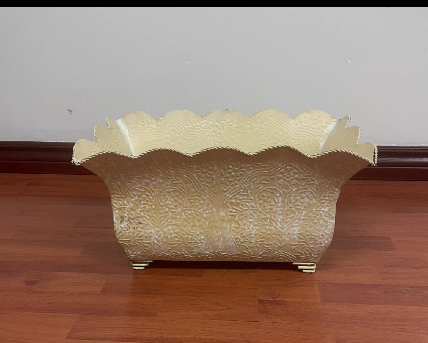 Here's a decorative light metal planter, perfect for adding a touch of charm to your home or garden! It features a unique design and a lovely colour that would complement any space.