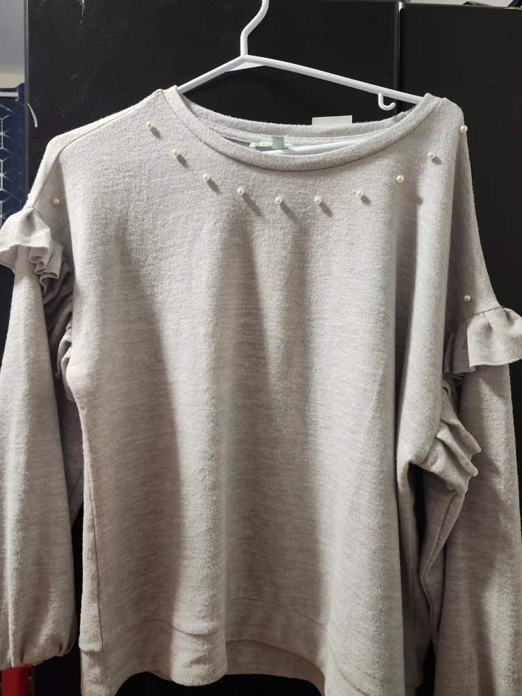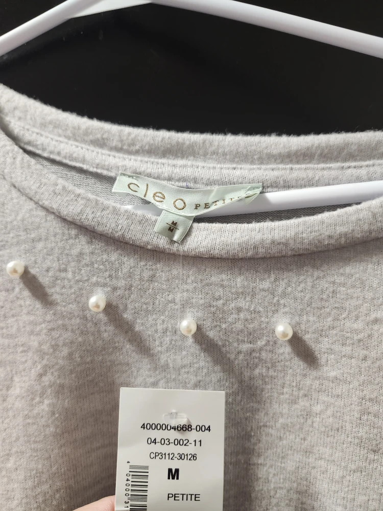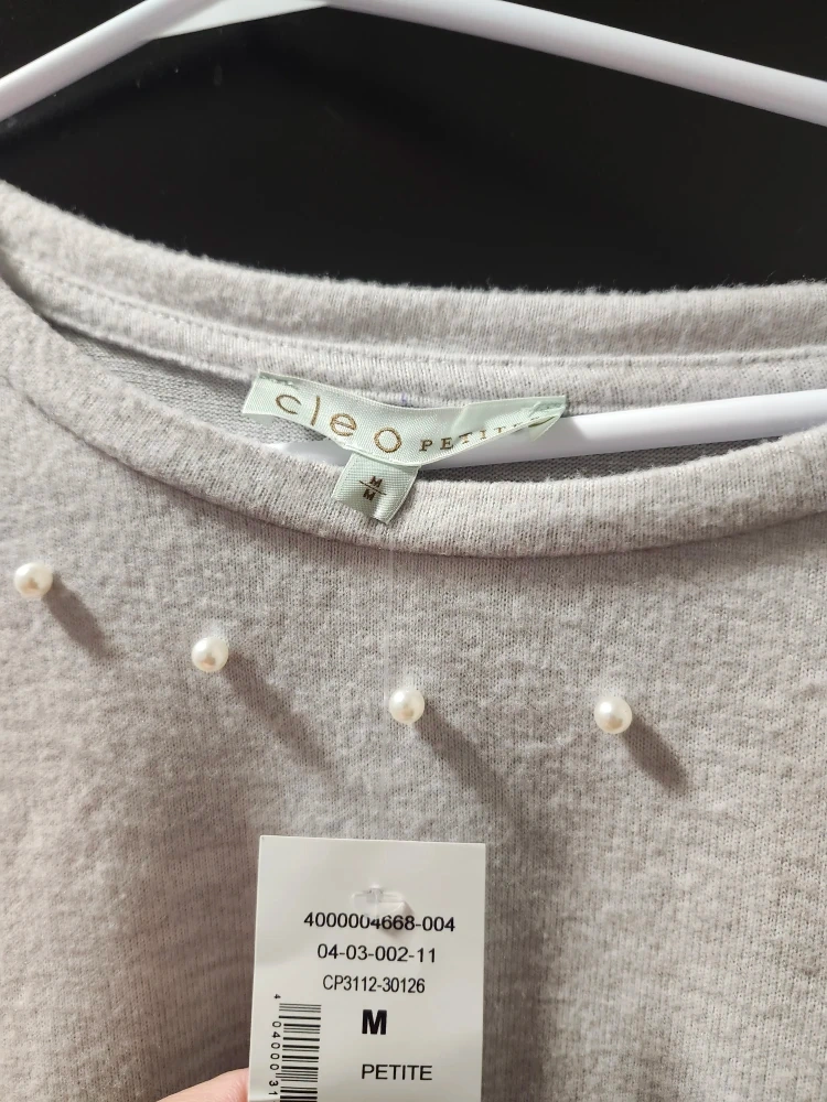 Giving away a cute Cleo Petite sweater in size M! It's a lovely light grey colour and has pearl details around the neckline. The sleeves also have a nice ruffle detail. It's in great condition and ready for a new owner!
