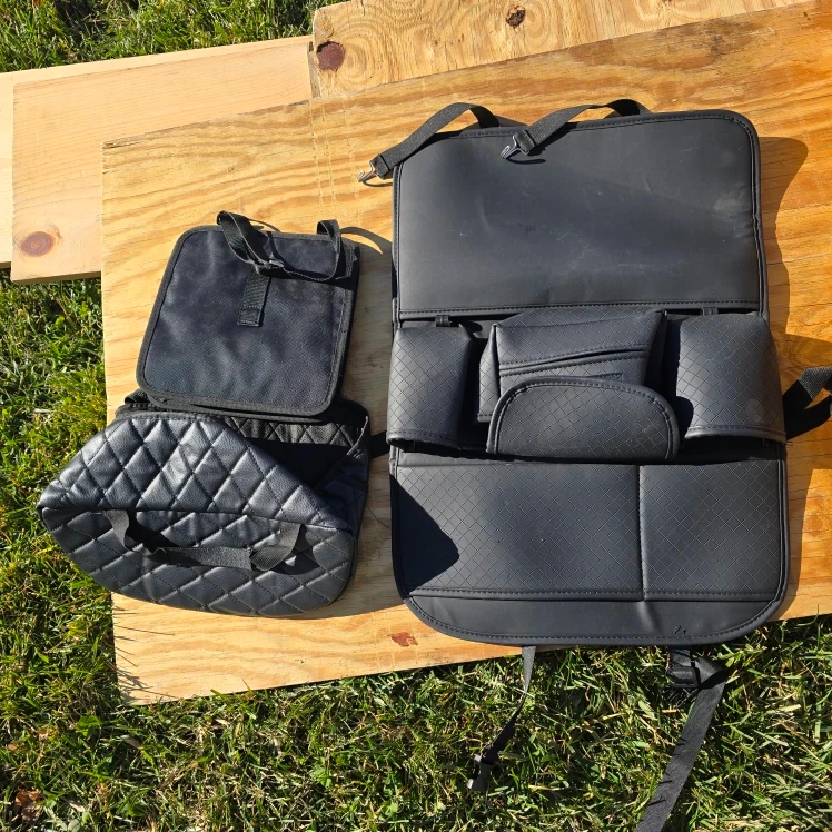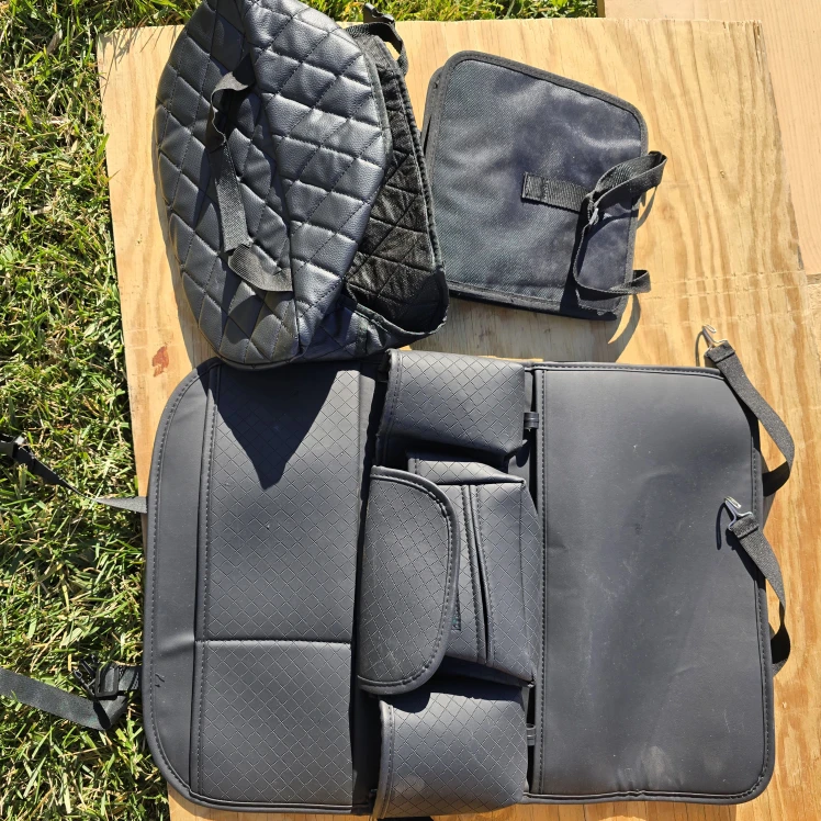 I'm selling a set of car backseat organizers in black. They are perfect for keeping your car tidy and organized! They include multiple compartments for storage.