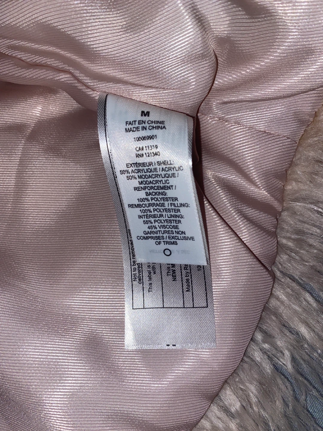 It's made with 80% acrylic and 20% modacrylic for the exterior, and the lining is 100% polyester