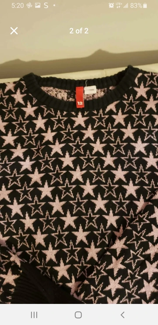 Selling a cute sweater! It's a size 12 and features a star pattern in pink and black. Perfect for adding a bit of fun to your wardrobe