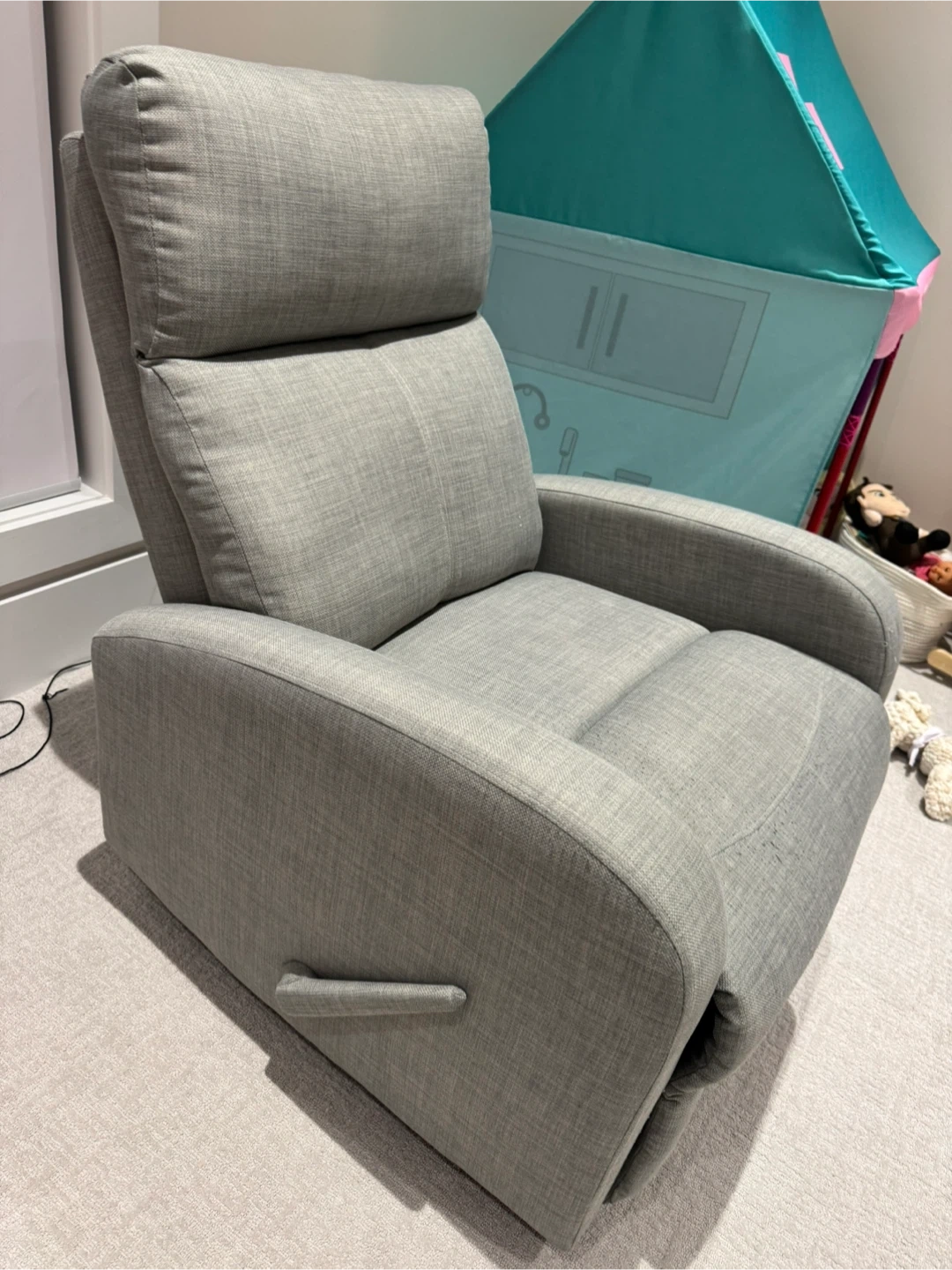 Selling a comfy grey recliner chair… perfect for a reading nook or nursery. The fabric is a nice neutral grey that would fit in with any decor. It's super comfortable and easy to recline. 5 years old, slight pilling at the seat.