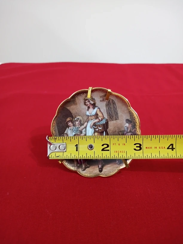 This is a beautiful Le Ray Limoges P France porcelain d'art plate. It measures approximately 3.25 inches in diameter. It features a scene of a woman and children with a dog.
