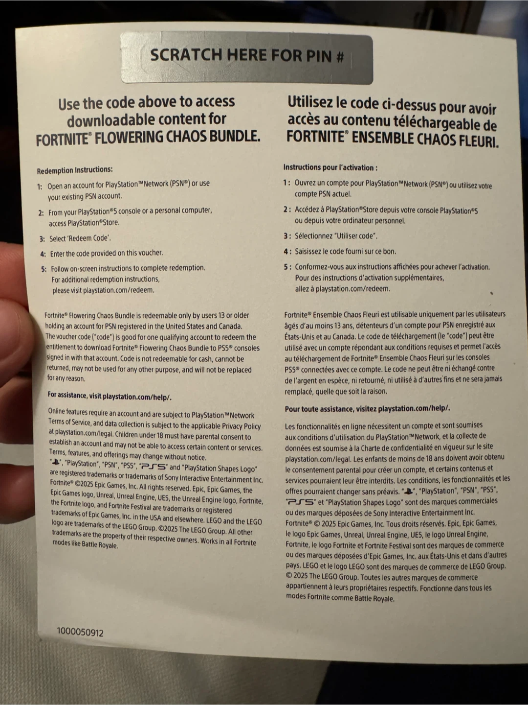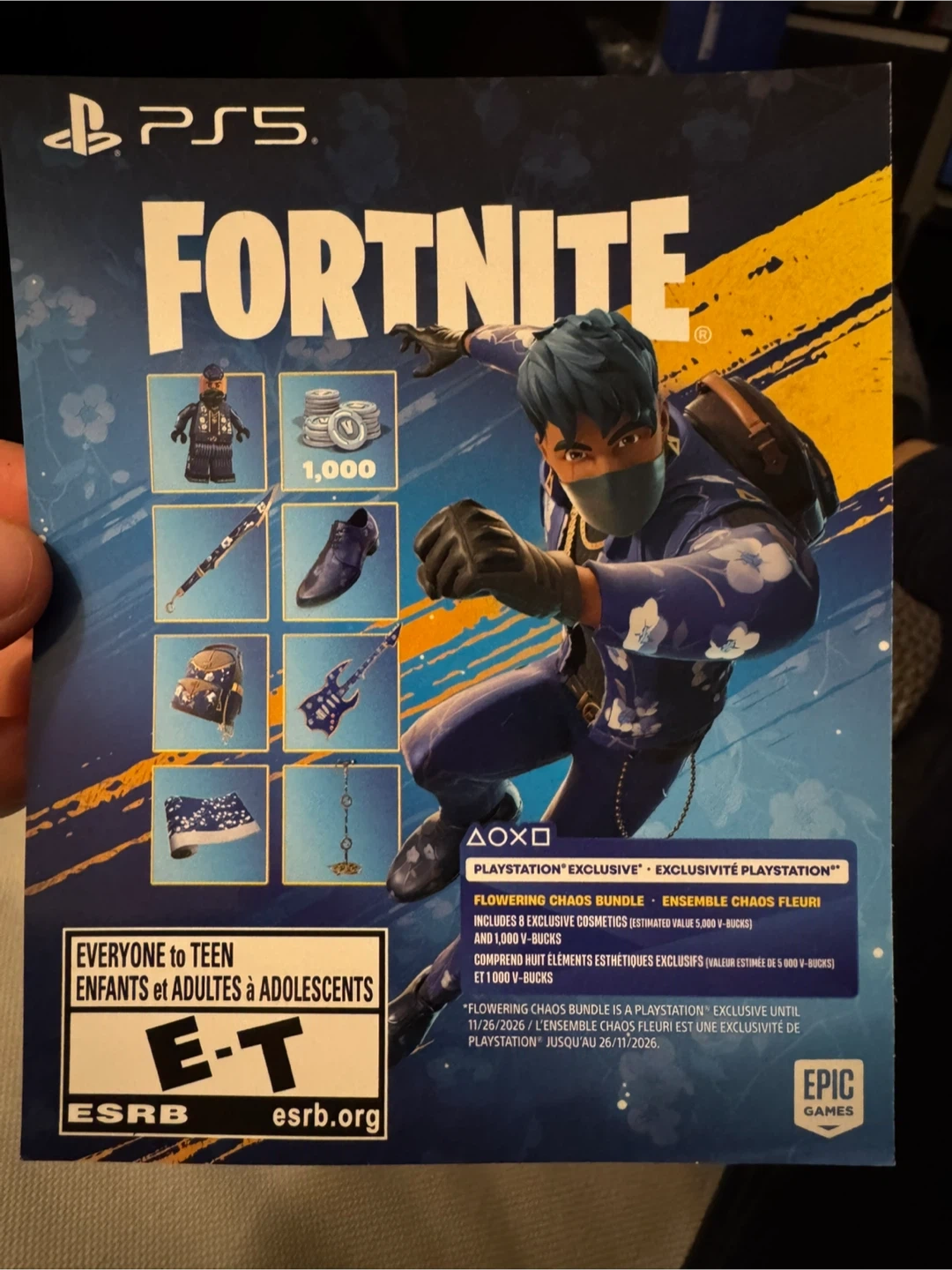 Selling a download code for the Fortnite Flowering Chaos Bundle on PS5. It includes 8 exclusive cosmetics and 1,000 V-Bucks. This came with PS5 I just purchased but I don’t play Fortnite so have no use for it.